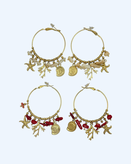 ARGOLAS DOURADAS EM AÇO COM DETALHES CORAL E PENDENTES