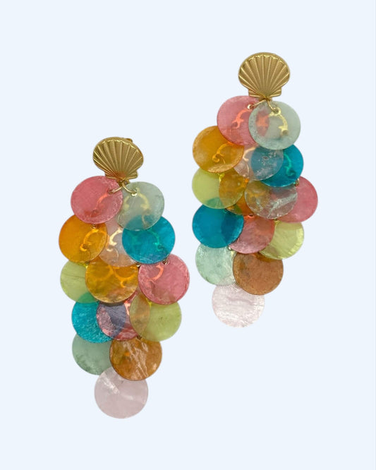 BRINCOS CONCHA DOURADA EM AÇO COM FRANJAS COLORIDAS