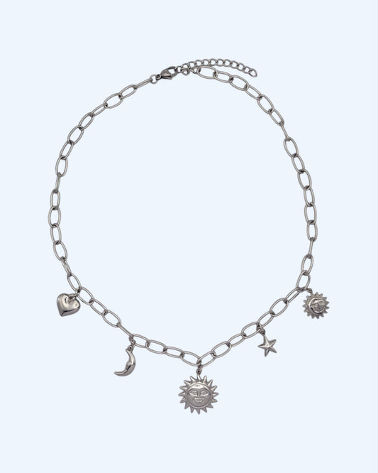 COLAR EM AÇO COM MEDALHAS DE SOL, LUA, ESTRELA E CORAÇÃO