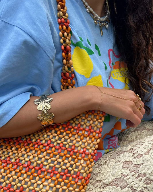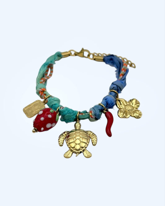 PULSEIRA BOHO COM TARTARUGA, FLOR E MORANGO EM AÇO