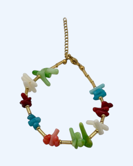 PULSEIRA COLORIDA COM PEÇAS EFEITO CORAL E AÇO DOURADO