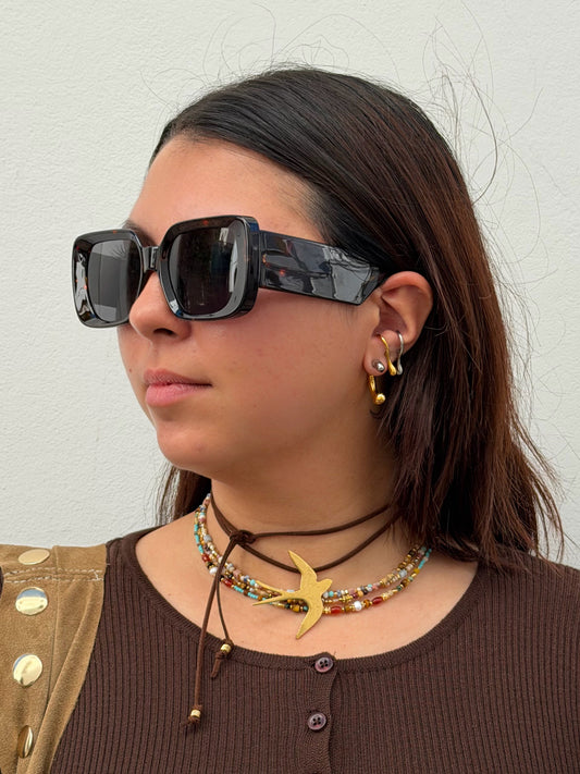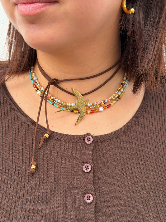 COLAR DE CAMURÇA COM PÁSSARO ANDORINHA EM AÇO INOXIDÁVEL