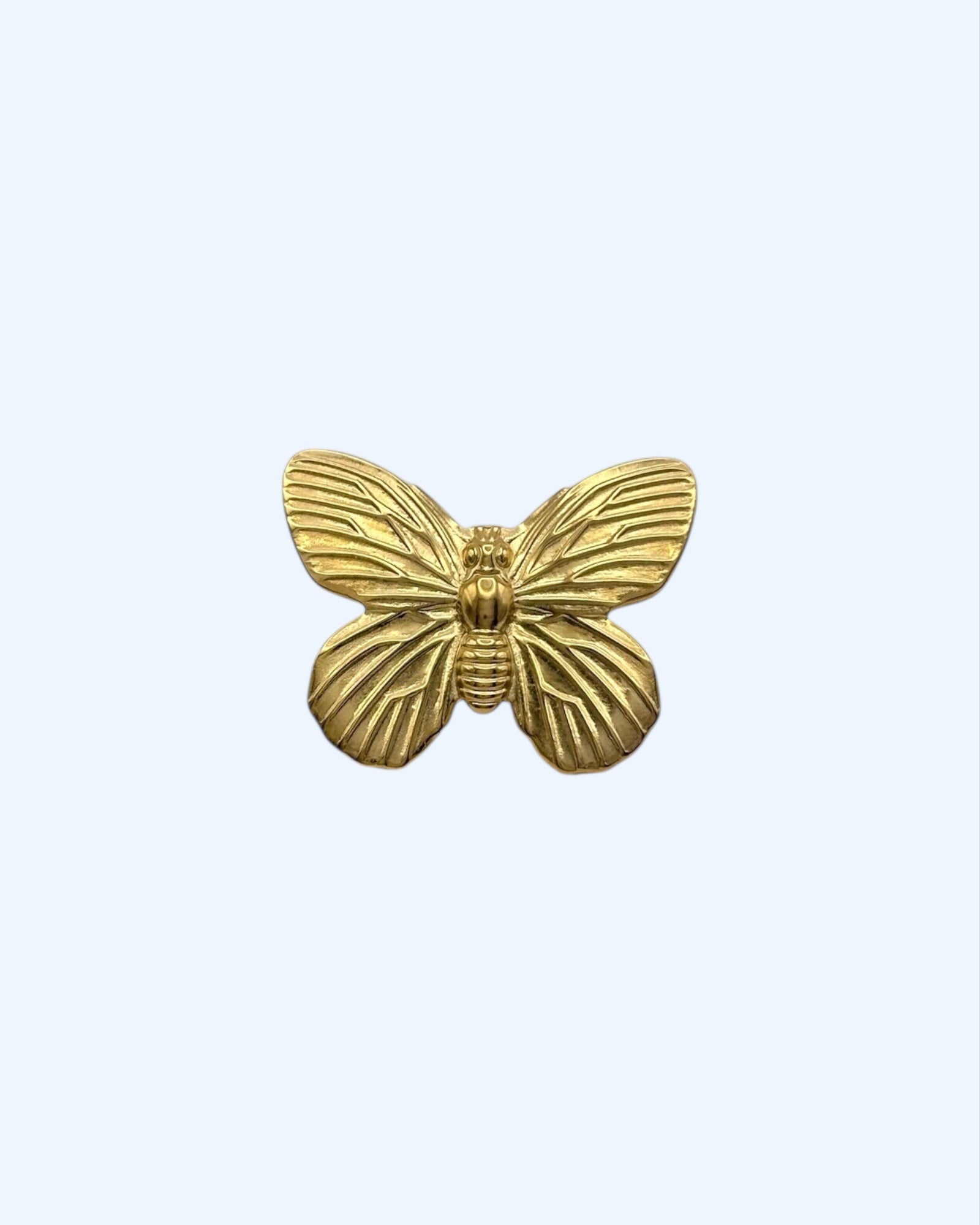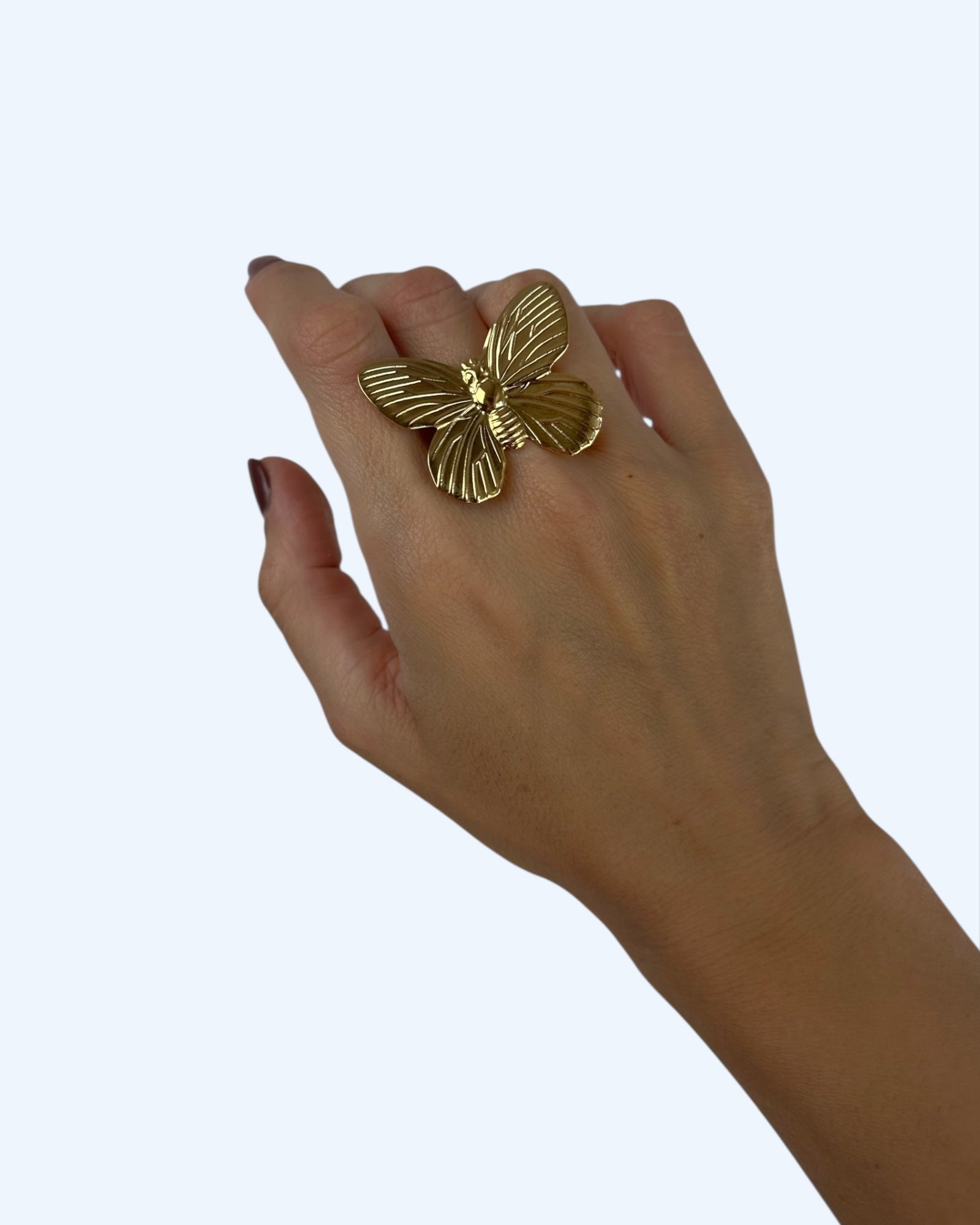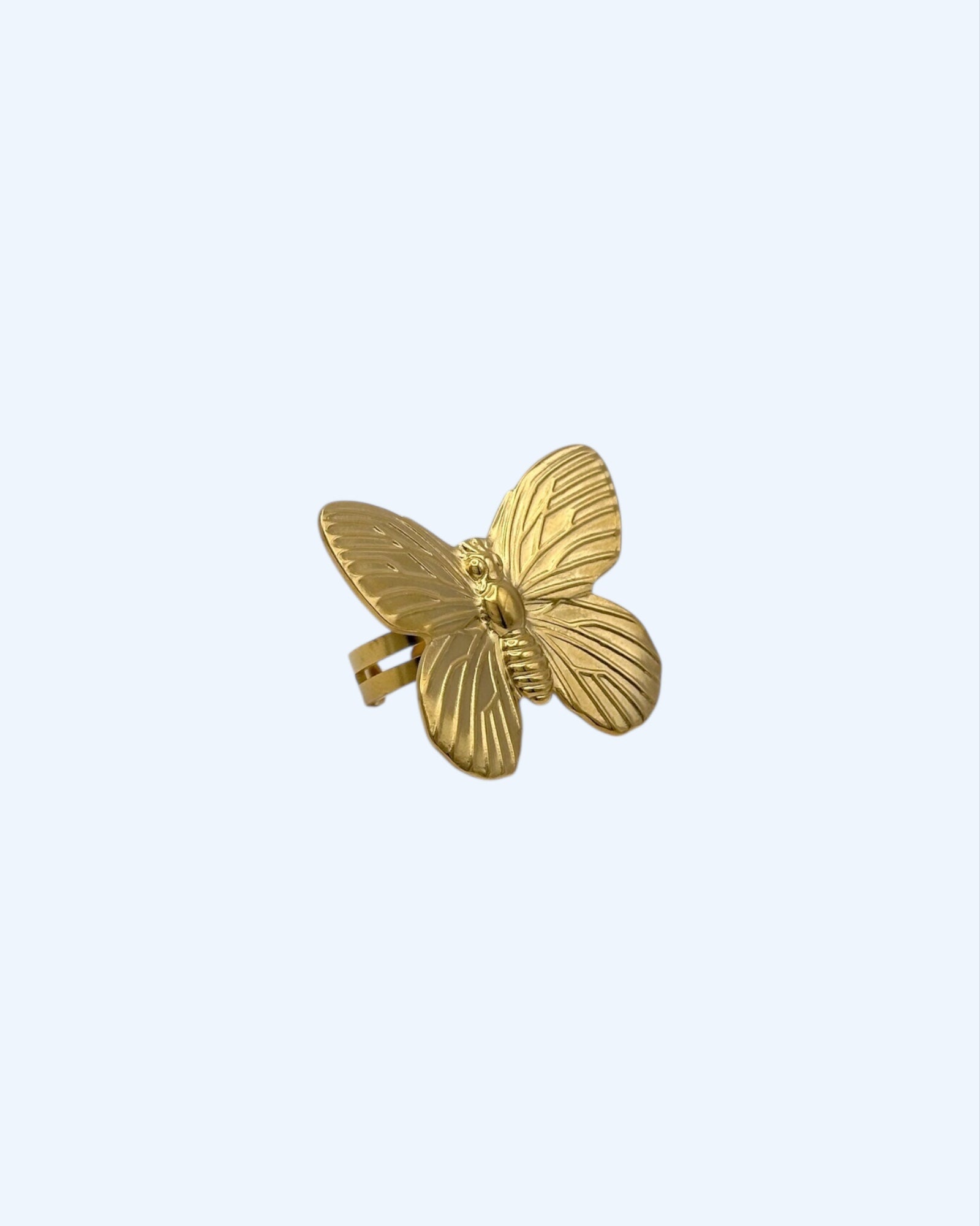 Este anel em aço inoxidável dourado traz uma borboleta oversized com textura detalhada. É leve na vibe, bold na presença.