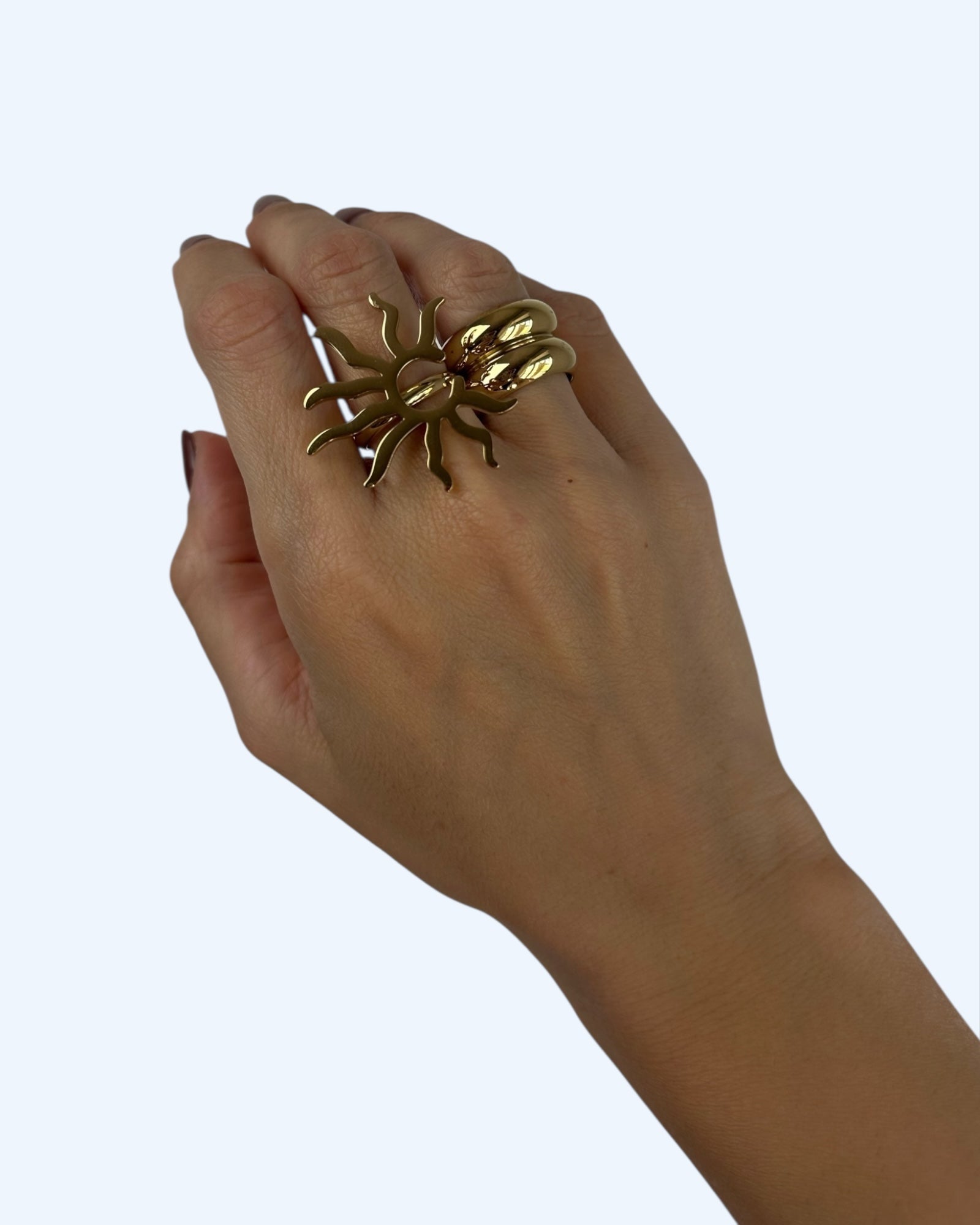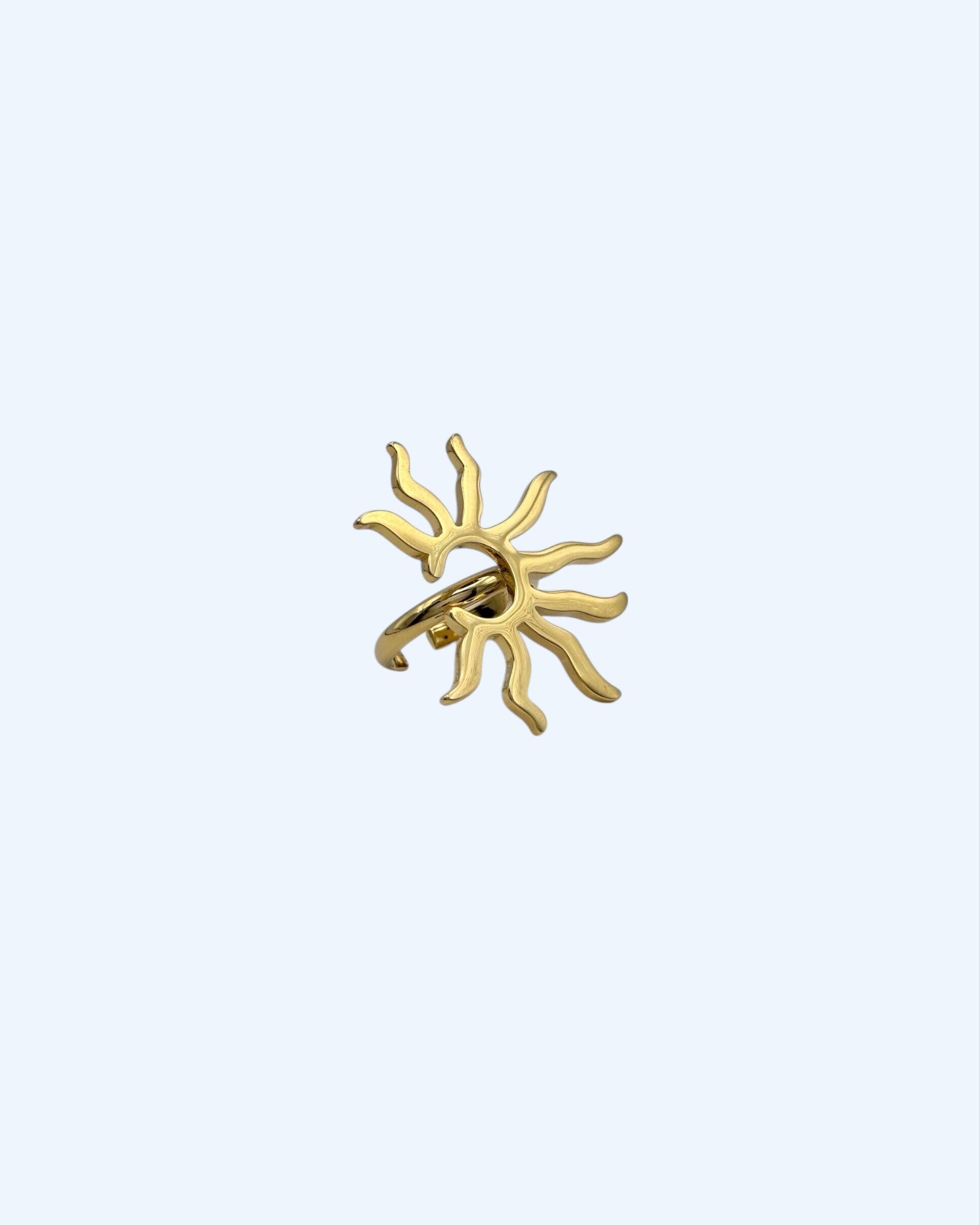 Solta o brilho que há em ti! Este anel dourado em forma de sol traz um vibe solar, boho e poderosa. Porque em algum lugar há-de ser verão. Feito em aço inoxidável.