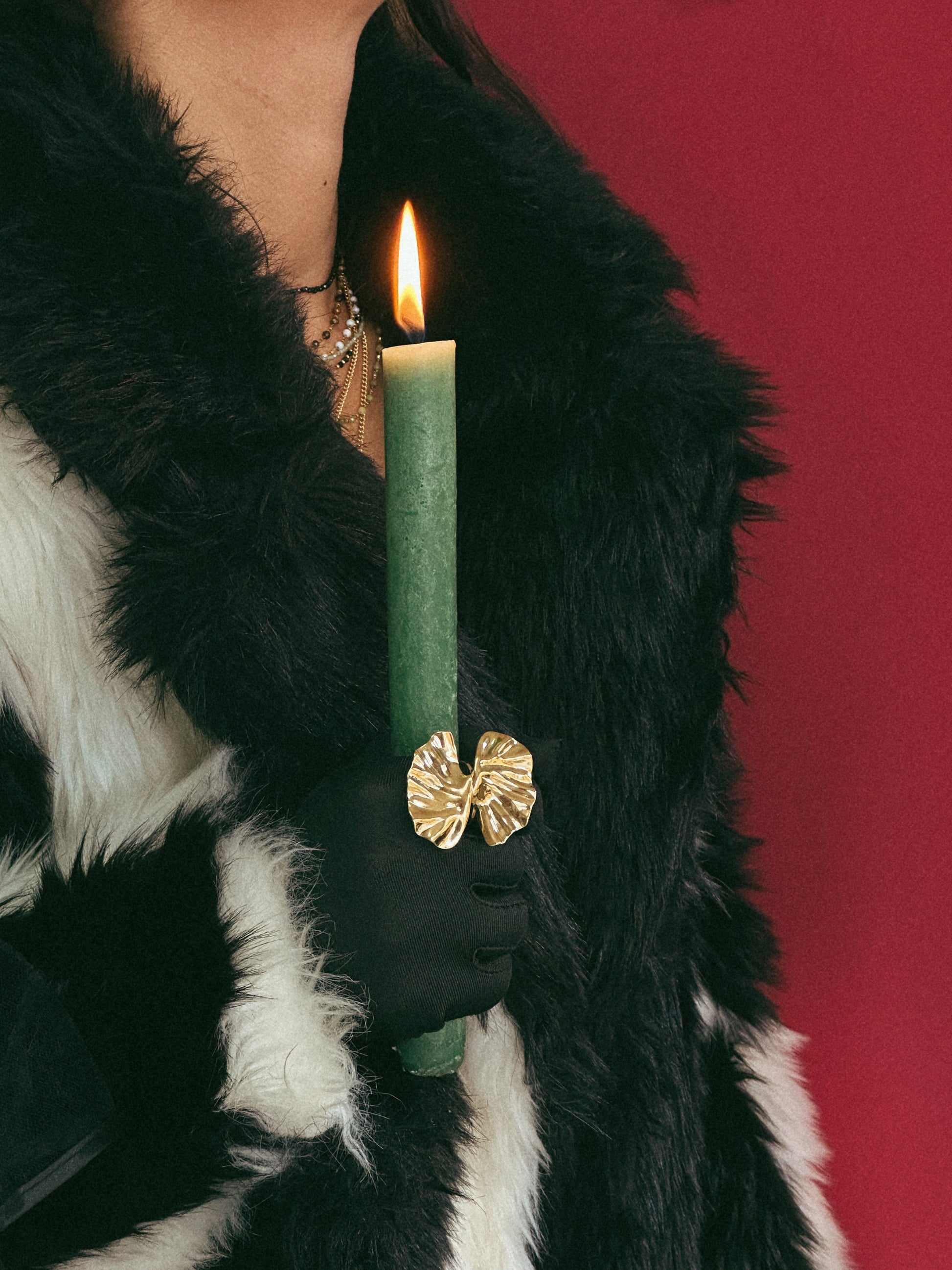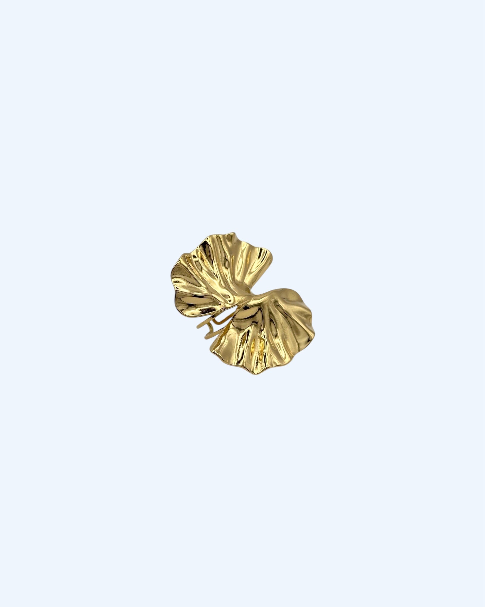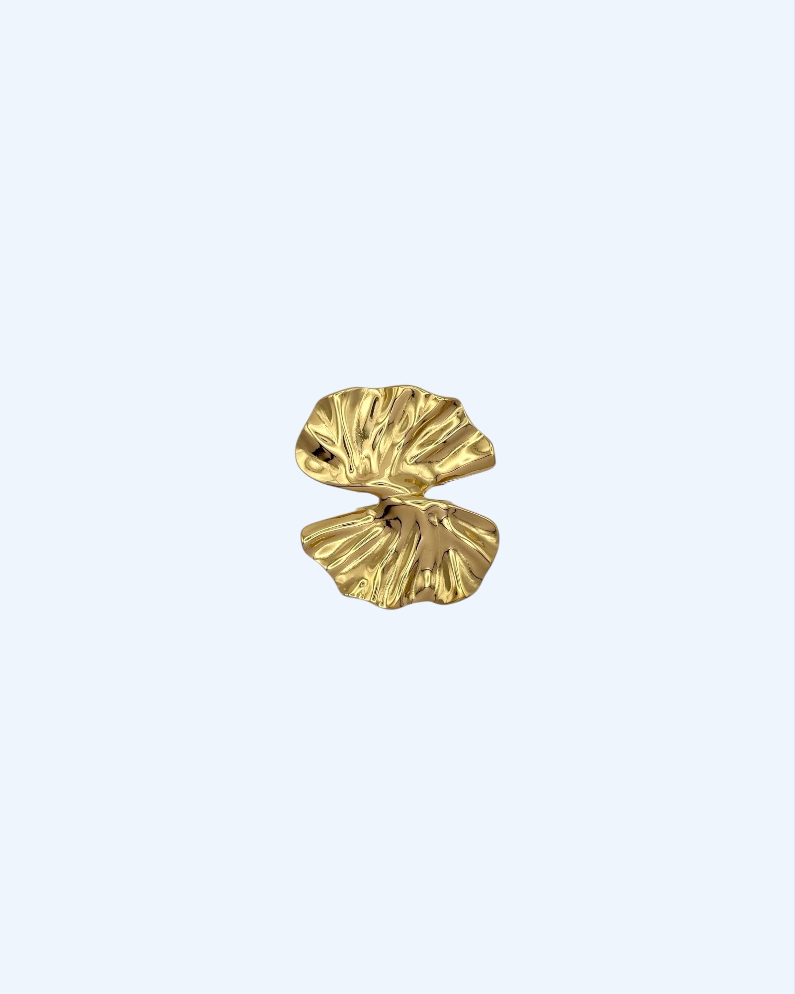 Brilha com atitude! Um anel dourado oversized com vibe escultural, inspirado em formas de folhas fluidas. Feito em aço inoxidável e ajustável para se adaptar a ti.