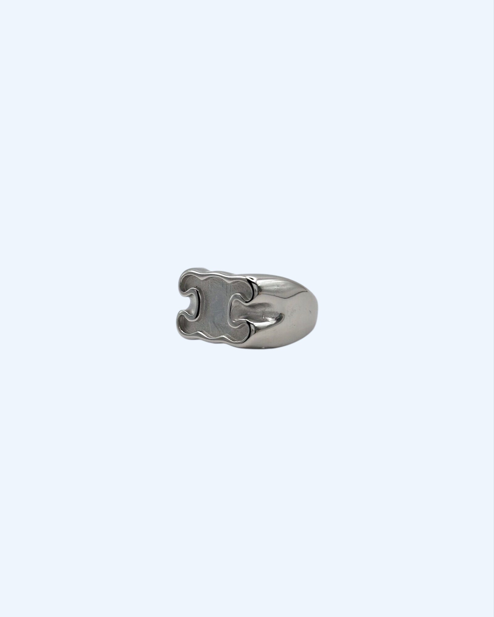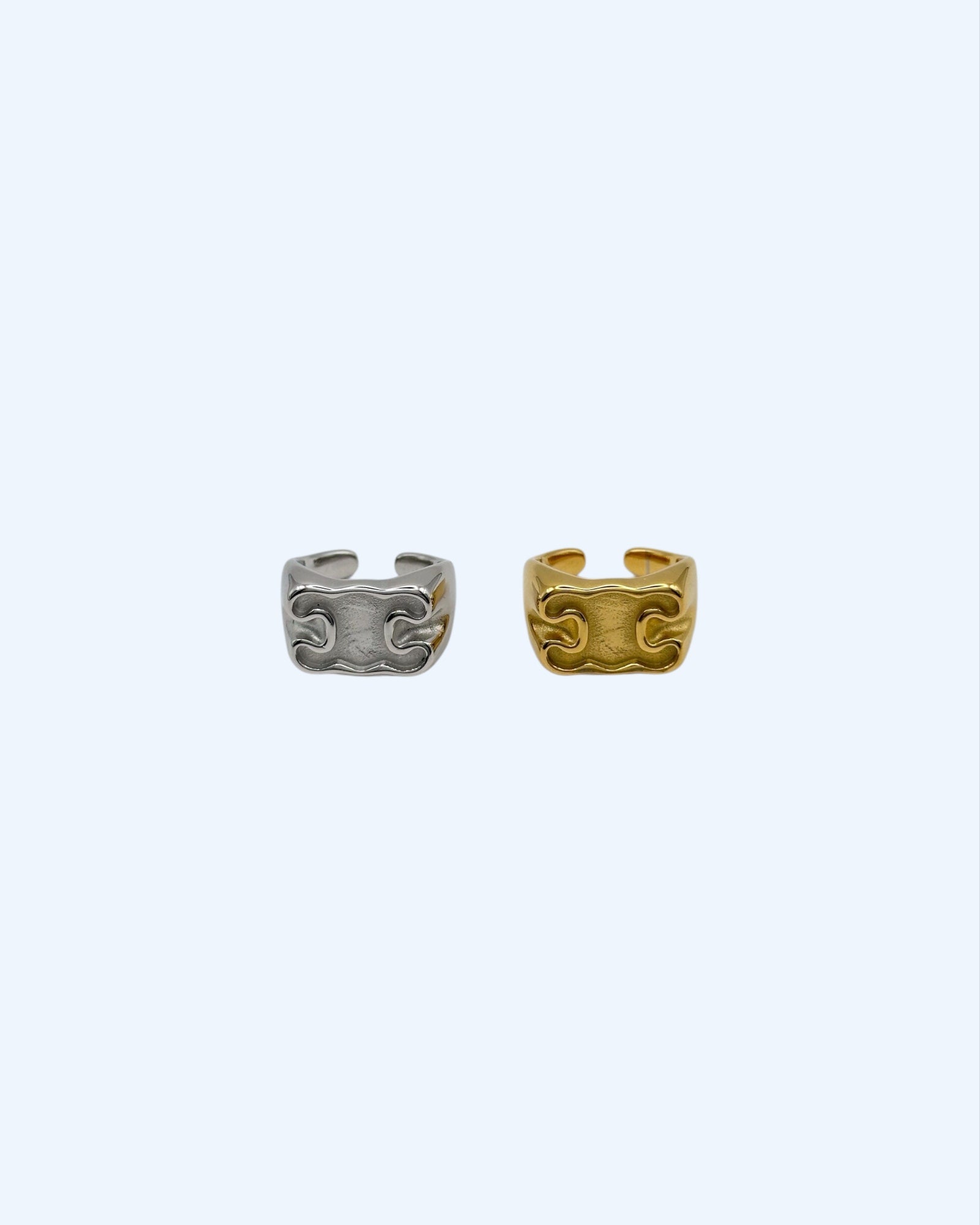 Com um design arrojado e irreverente, este anel em aço inoxidável é um statement. Disponível em dourado e prateado.