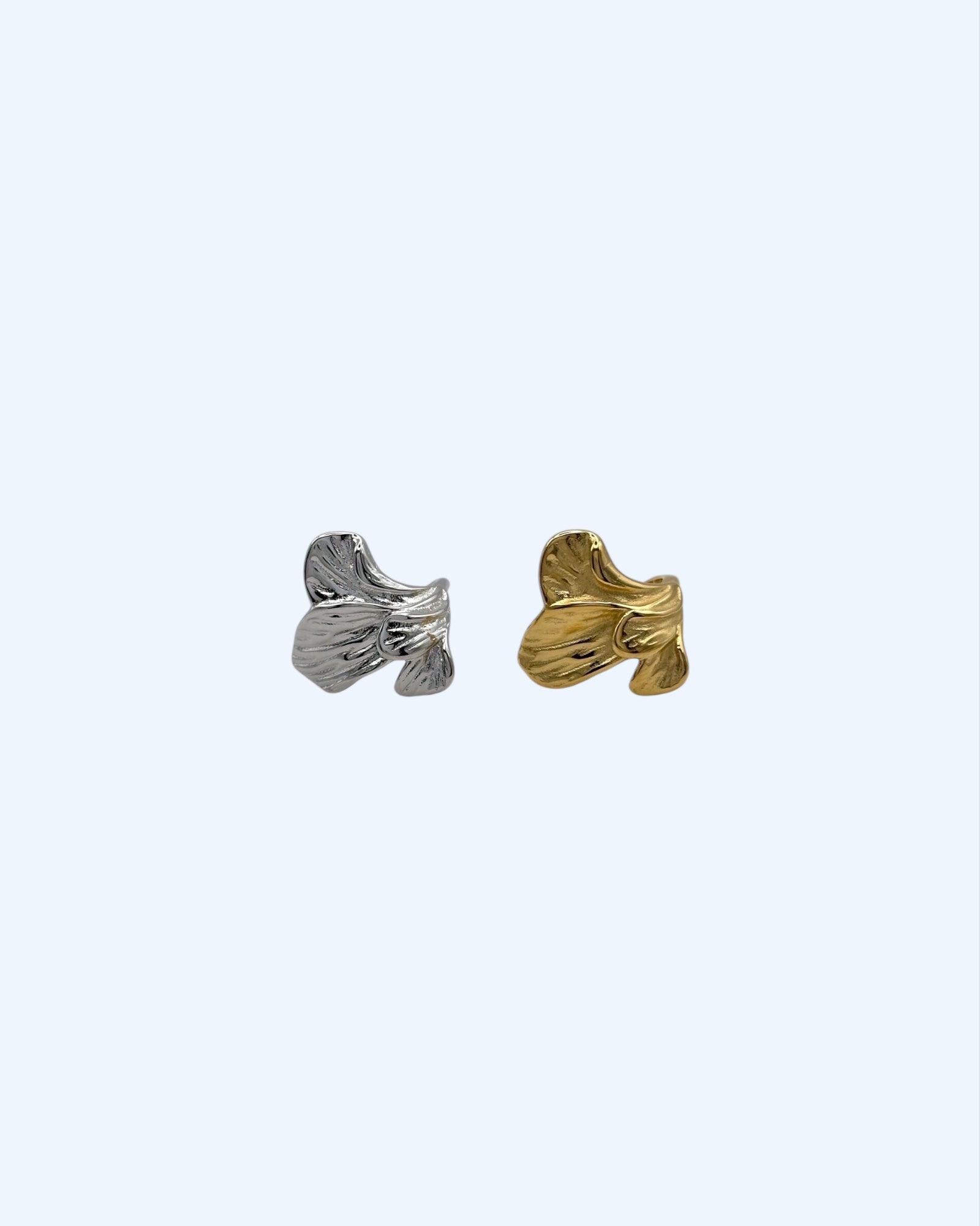 Com a silhueta de uma folha ao vento, este anel em aço inoxidável é puro movimento. Bold, fluido e disponível em dourado e prateado.