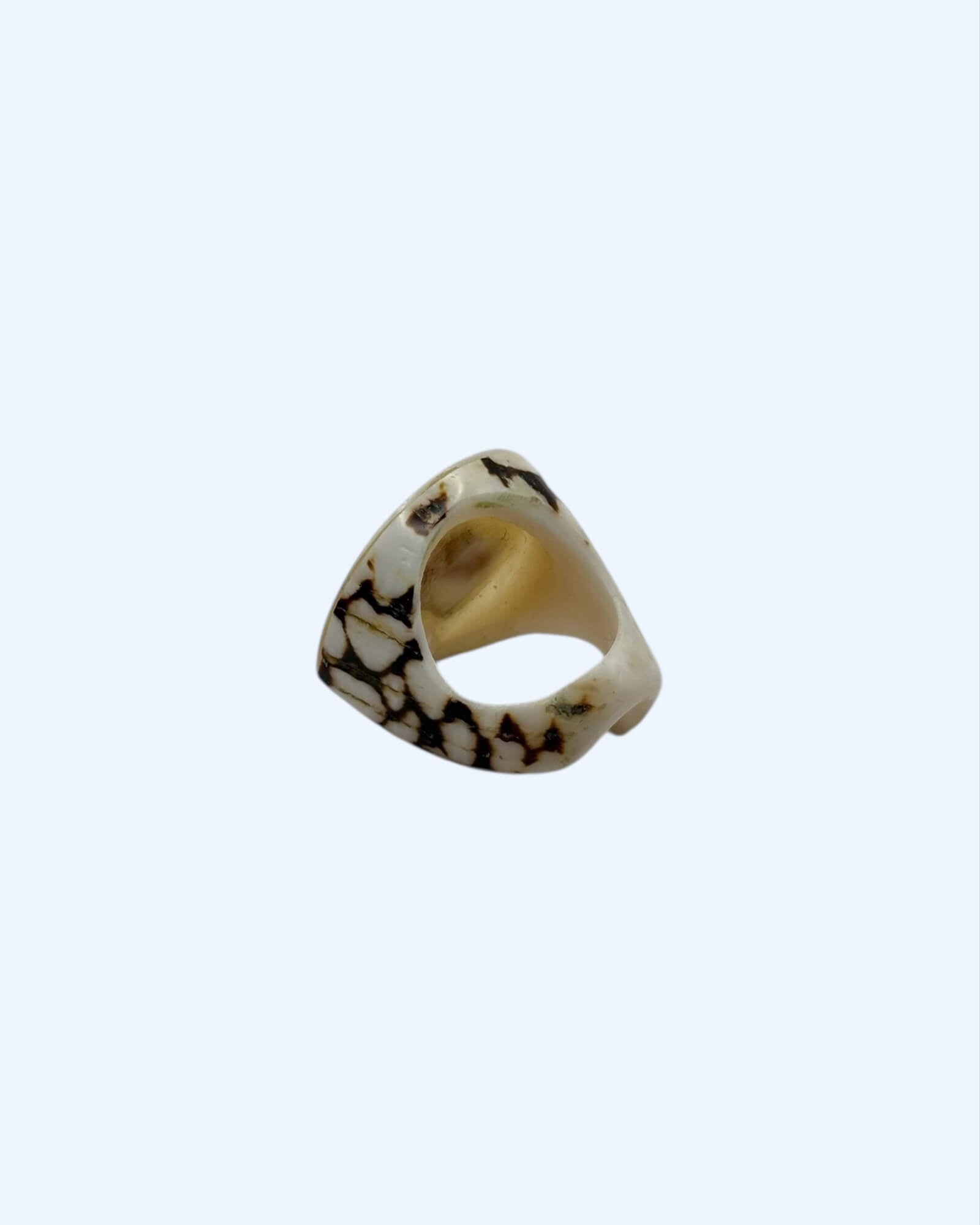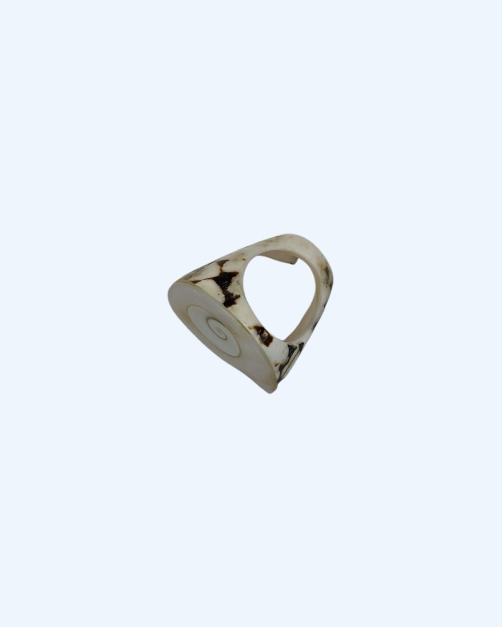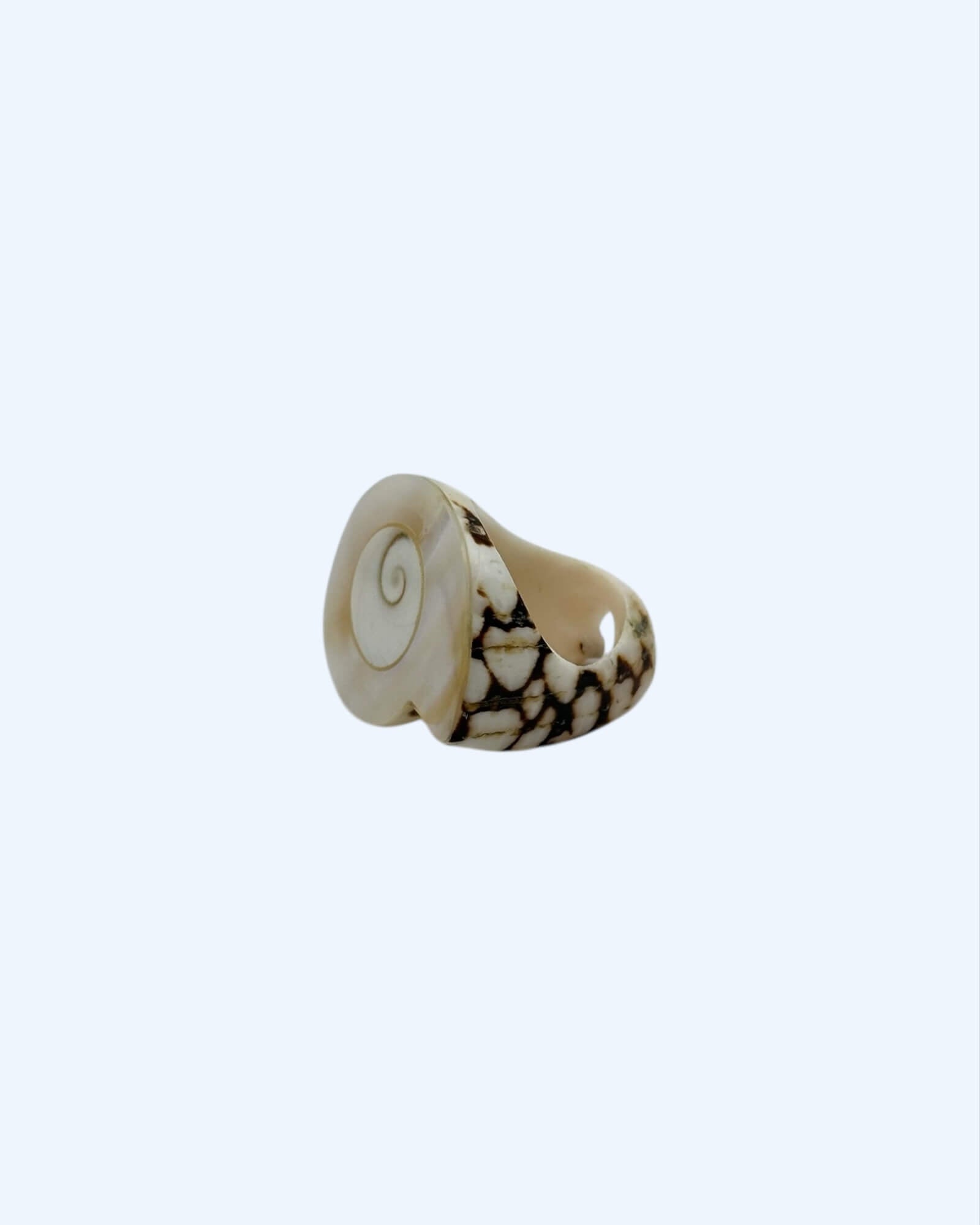 Este anel de búzio natural tem uma espiral em tons de branco envolvida num padrão que evoca o selvagem e livre do oceano. Um statement místico, com textura e identidade boho.