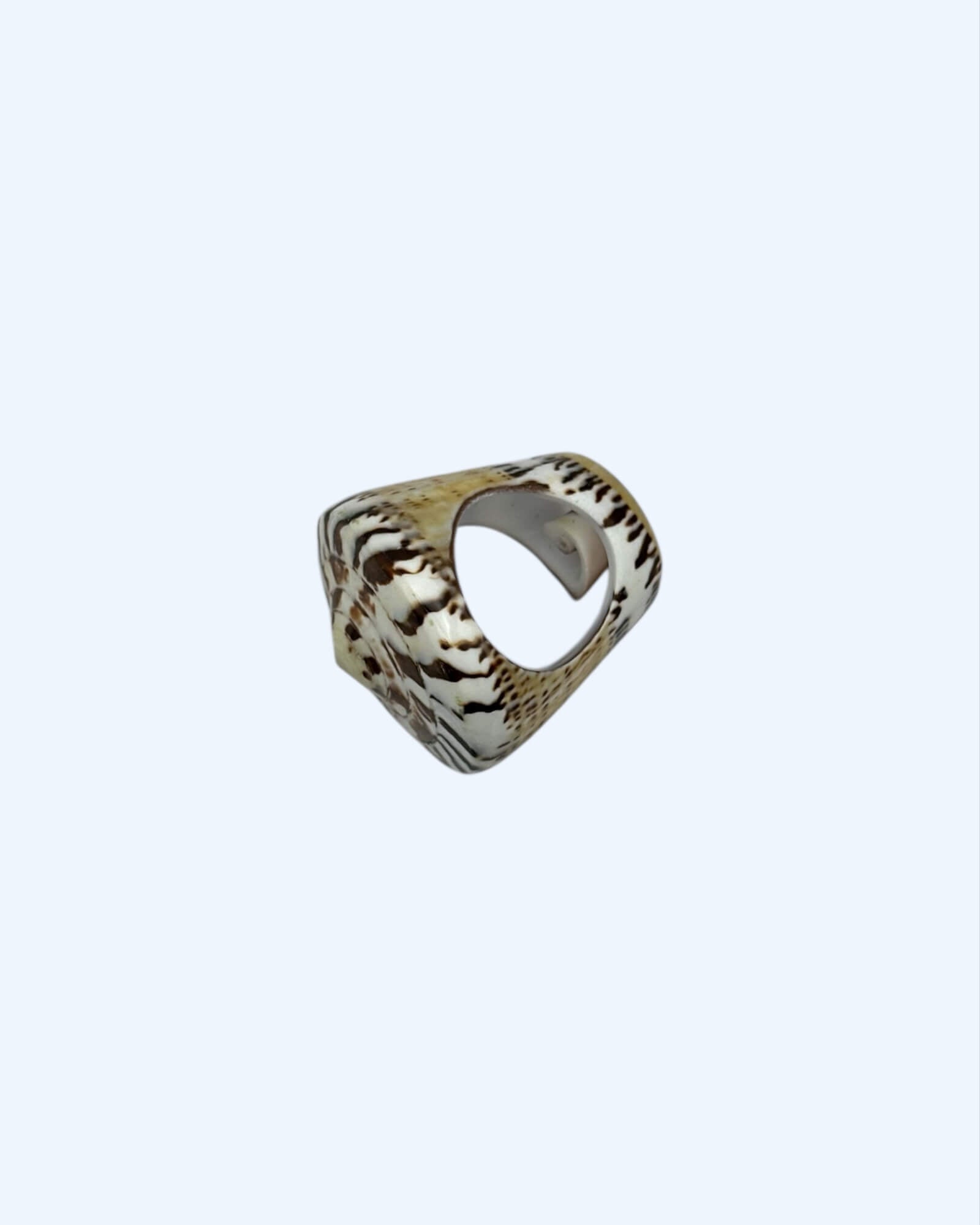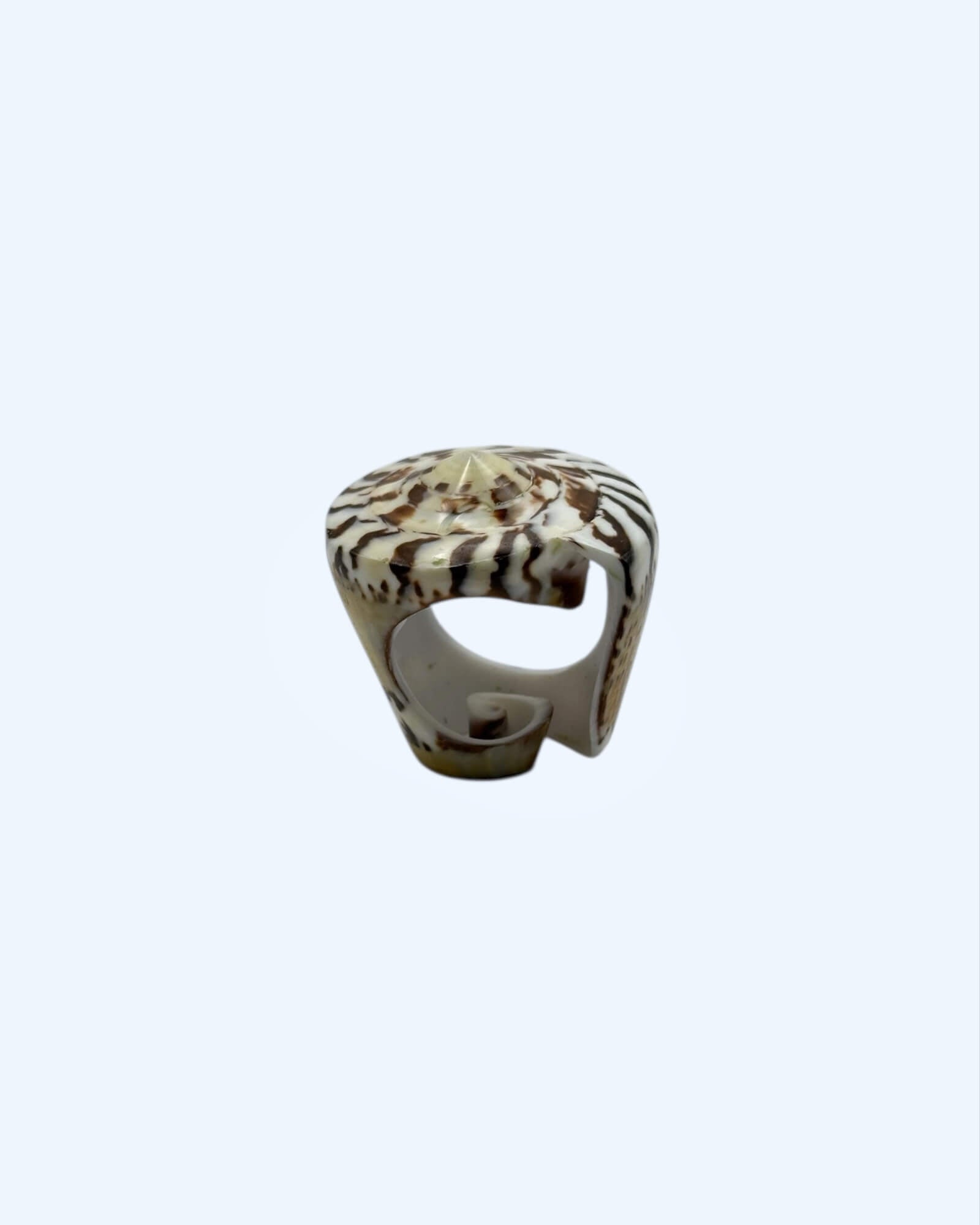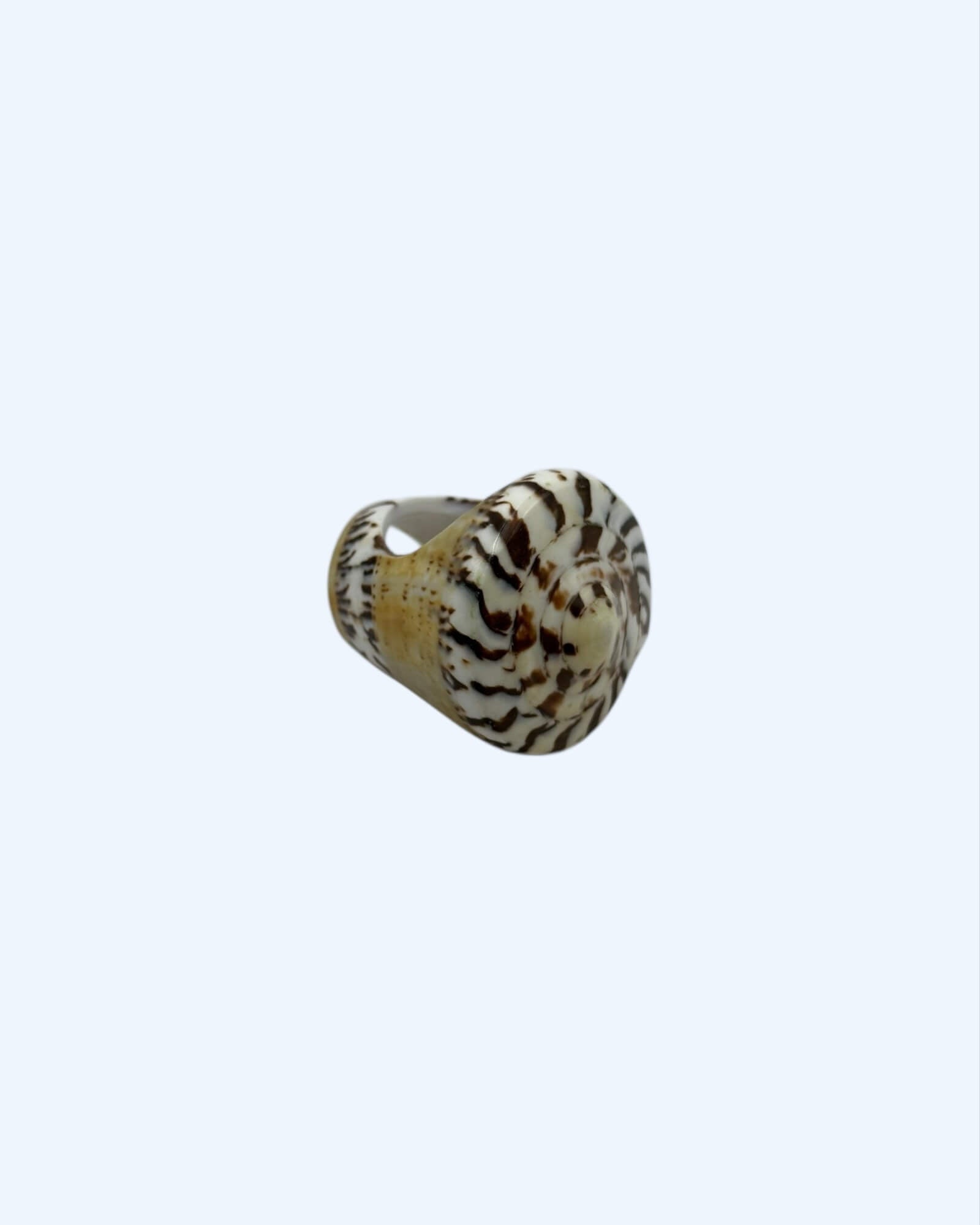 Trás a praia no teu dedo. Wild & raw, este anel com búzio natural em espiral mistura tons beges e castanhos num padrão orgânico que grita liberdade e natureza. Cada peça é única, tal como tu.