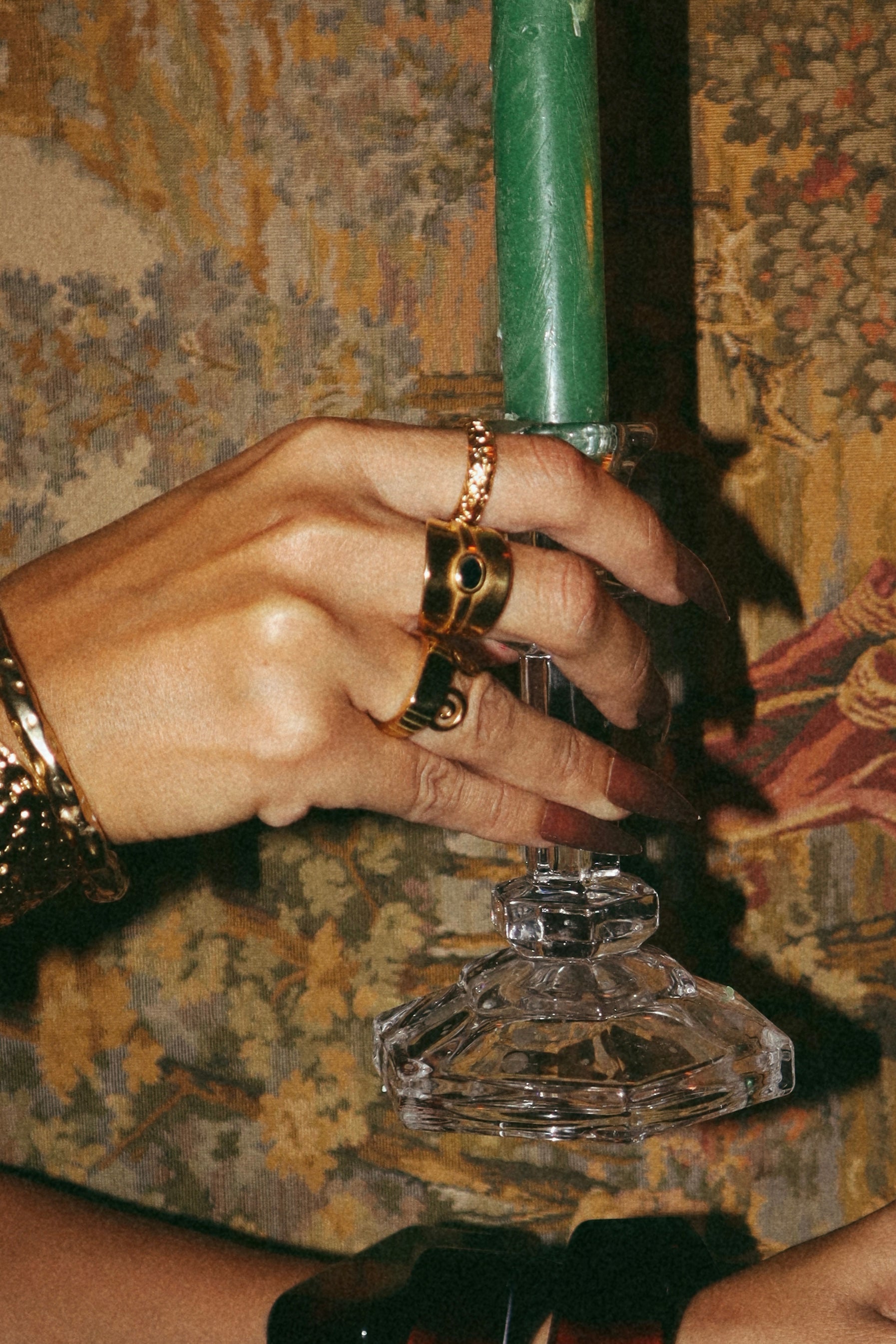 Anel em aço inoxidável com uma pedra central preta que evoca o poder de relíquia.
