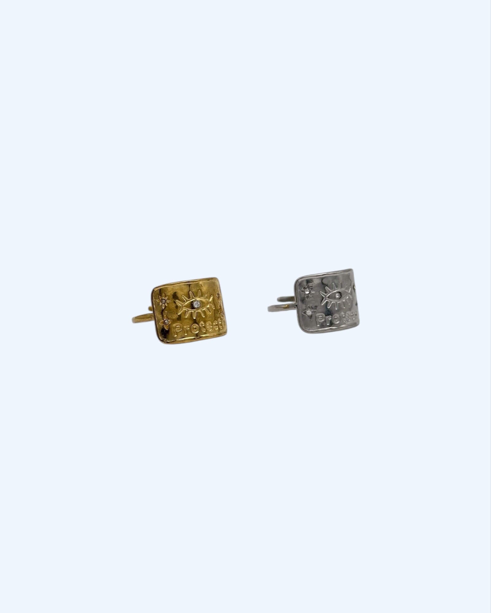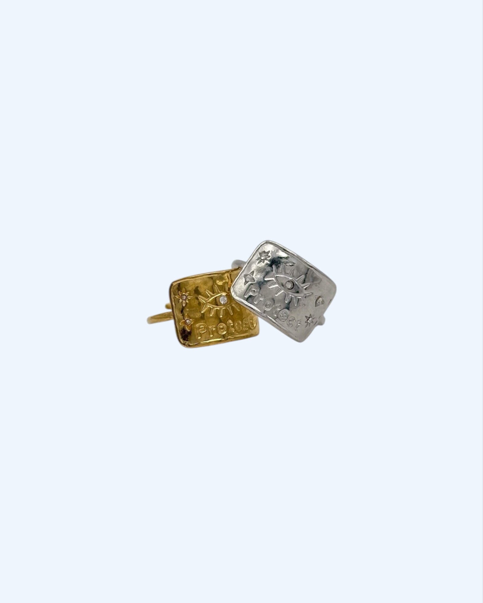Este anel ajustável em aço inoxidável tem uma vibe mágica com olho gravado, estrelas e a palavra “protect”. Este talismã está disponível em dourado e prateado.