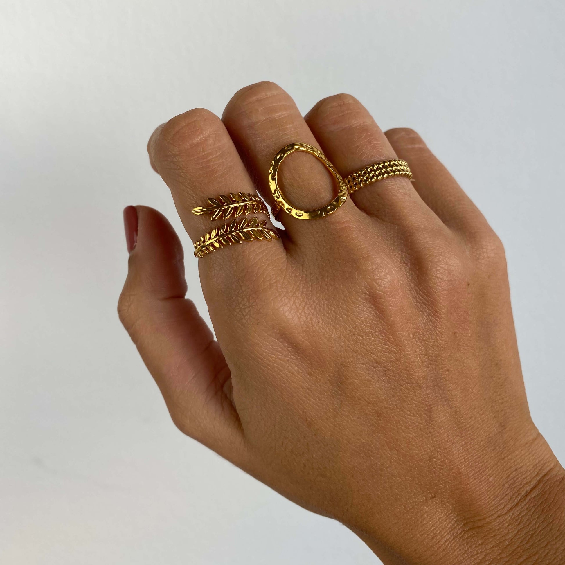 Anel ajustável em aço inoxidável, com forma oval com textura martelada recortada.