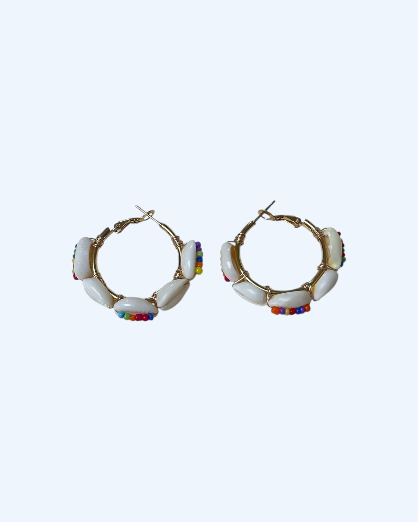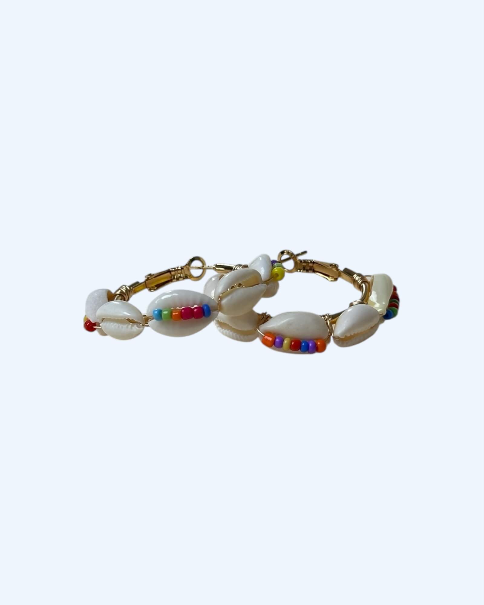 Argolas douradas em aço inoxidável com búzios naturais e missangas coloridas. São por sim um mood tropical que facilmente qualquer outfit irá agradecer. São leves, são cool e têm cara de férias e simultaneamente, perfeitas para a cidade, ou qualquer outra atmosfera.