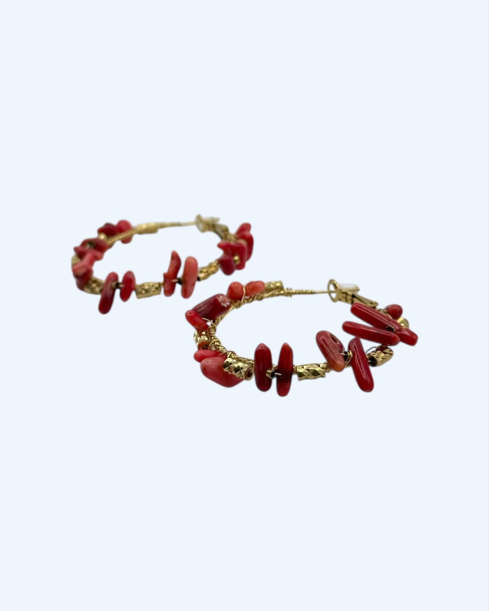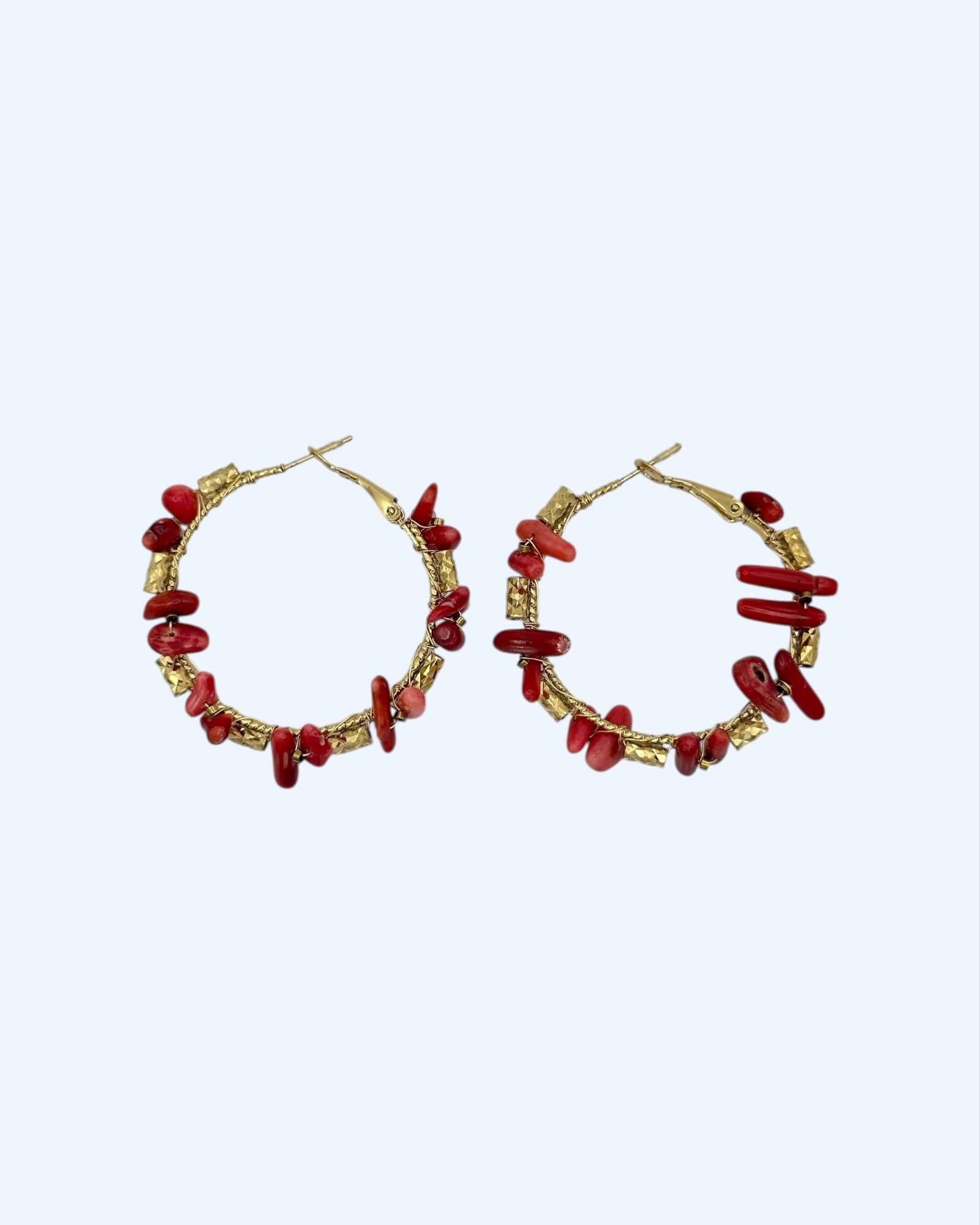 Argolas douradas em aço inoxidável com fecho de segurança decoradas com peças que representam coral vermelho. Um mix entre o dourado texturizado e o vermelho vibrante que grita verão, praia e liberdade. Perfeitas para looks boho-chic cheios de atitude.