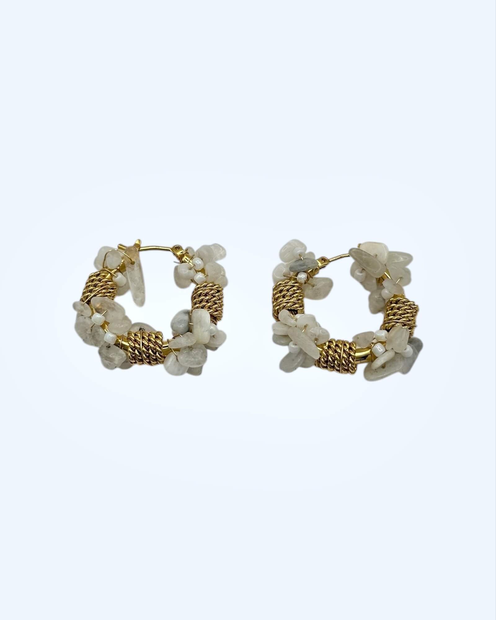 Argolas douradas em aço inoxidável decoradas com pedras. Um mix entre textura e cor para looks boho. Disponíveis em branco mármore, vermelho coral e multicolor.