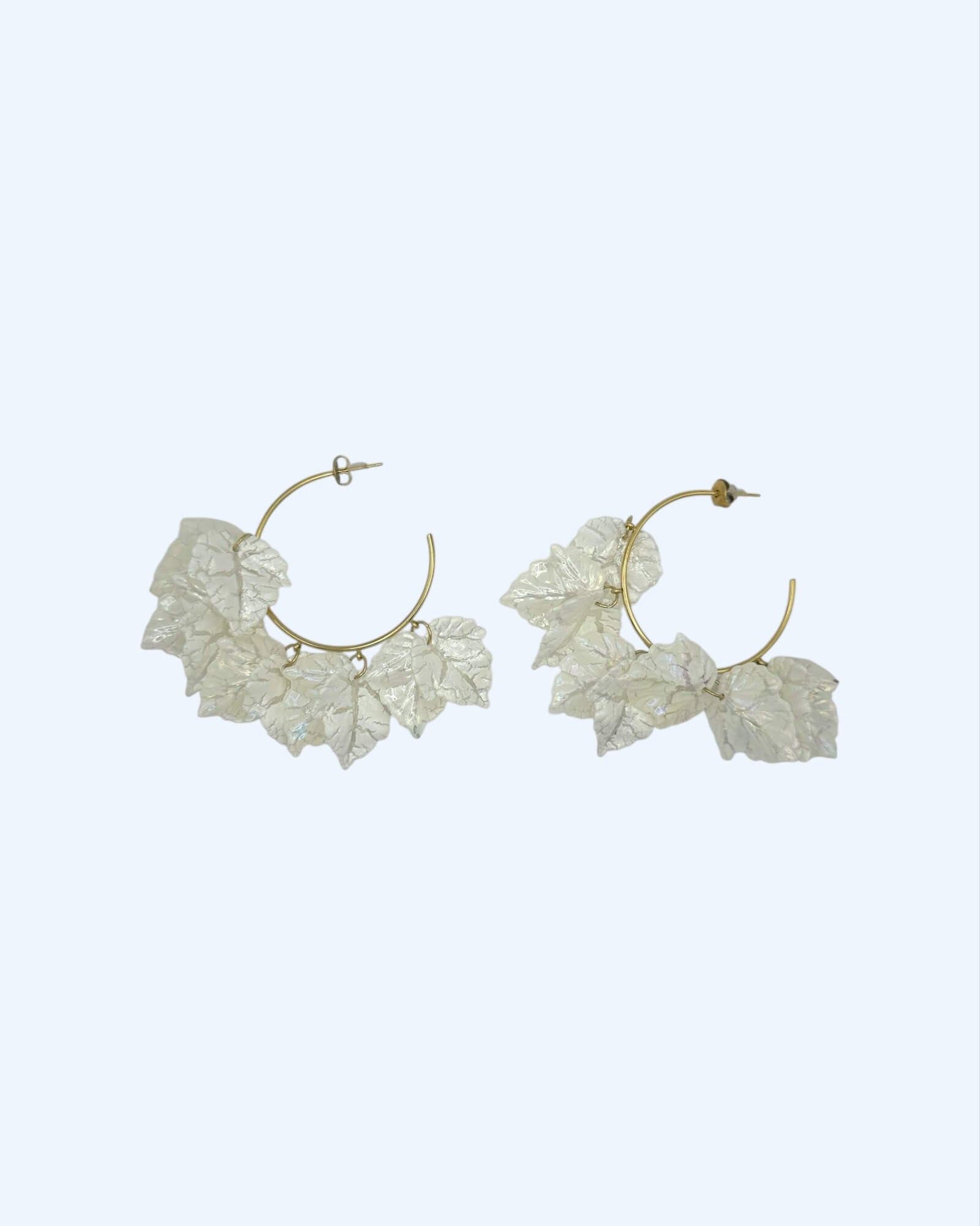 Argolas meia lua douradas em aço inoxidável com folhas acrílicas translúcidas que brilham com reflexos iridescentes. Uns brincos que são simultaneamente leveza e bold, para um mood cool e etéreo.