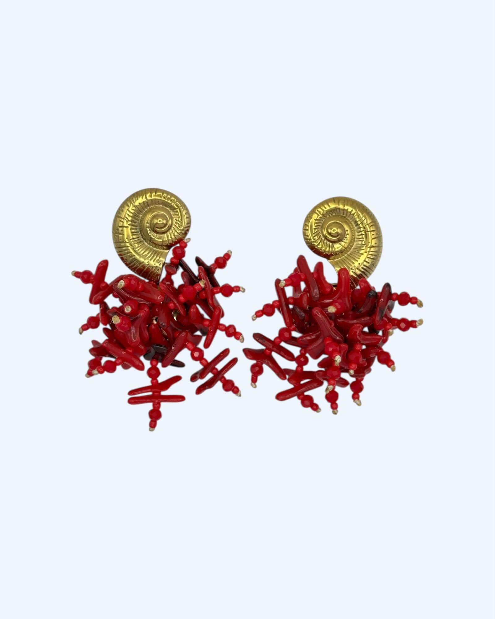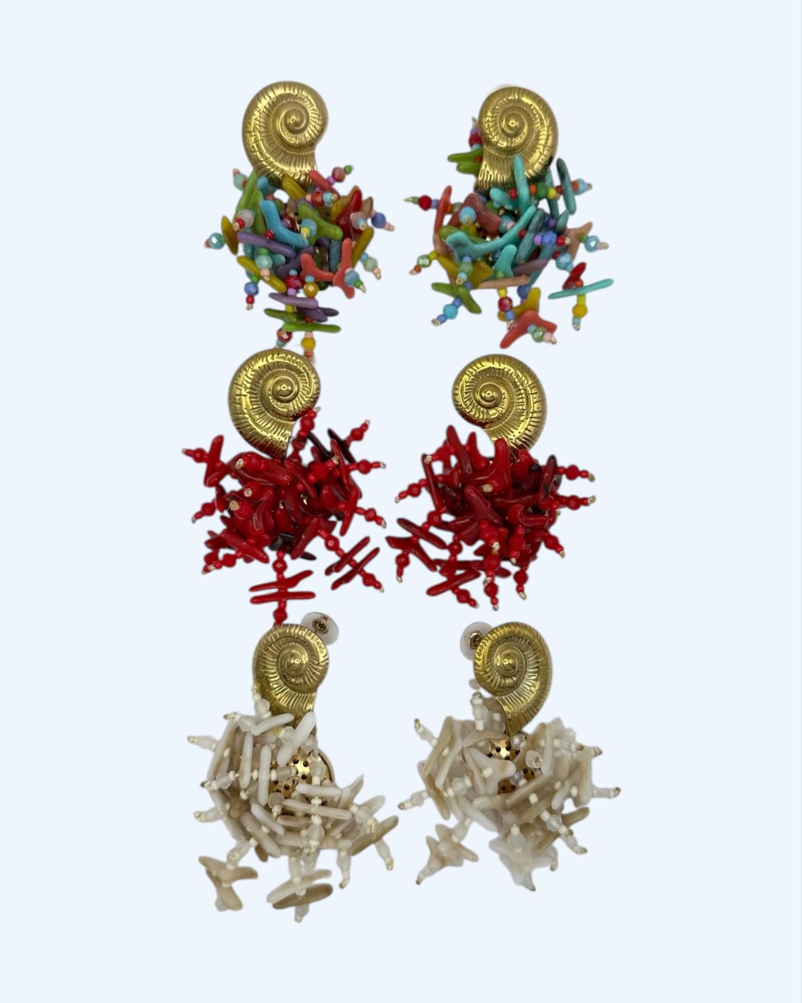 Brincos em aço inoxidável com forma de caracol do mar dourado e pendentes em missangas e formas de coral. Disponíveis em branco natural, vermelho ou mix multicolorido. Irresistíveis!