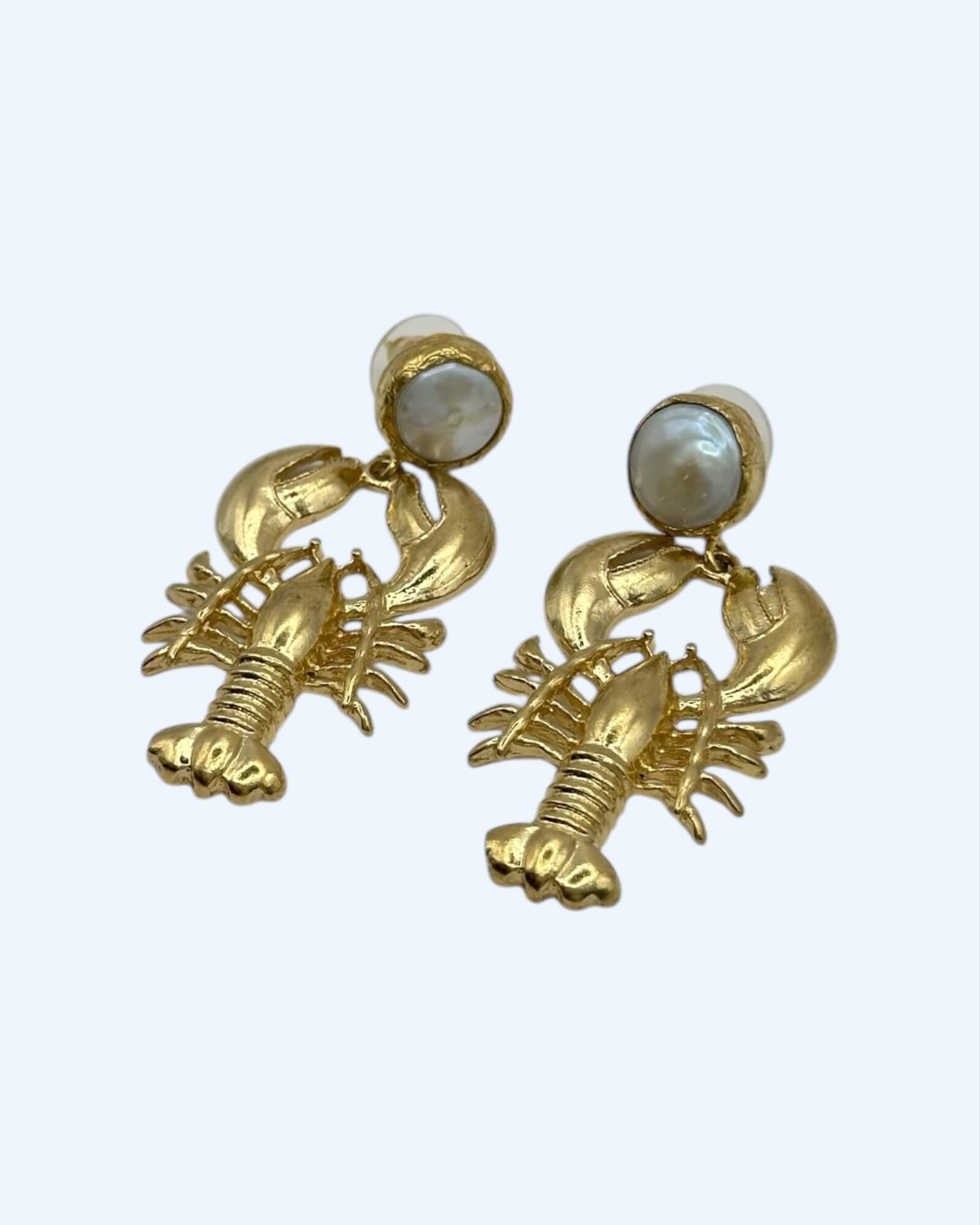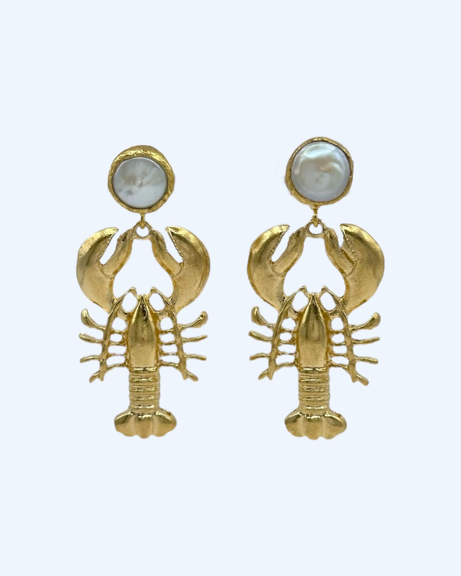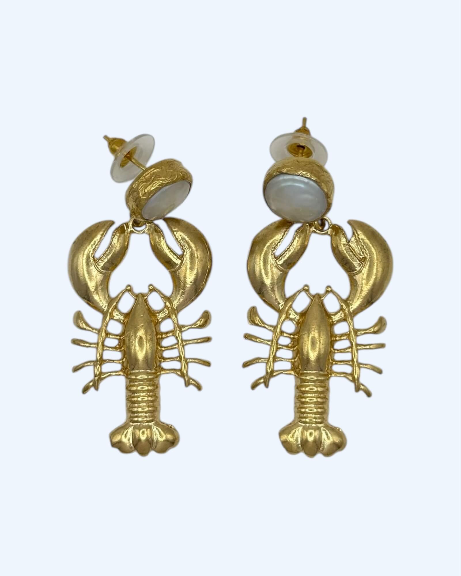 Brincos statement dourados com pendente de lagosta e topo em madrepérola. Uma fusão boho-marinha perfeita para vibes solares, festas e sunsets à beira-mar. Feitos em latão, com o requinte certo para tornares o teu dia marcante.
