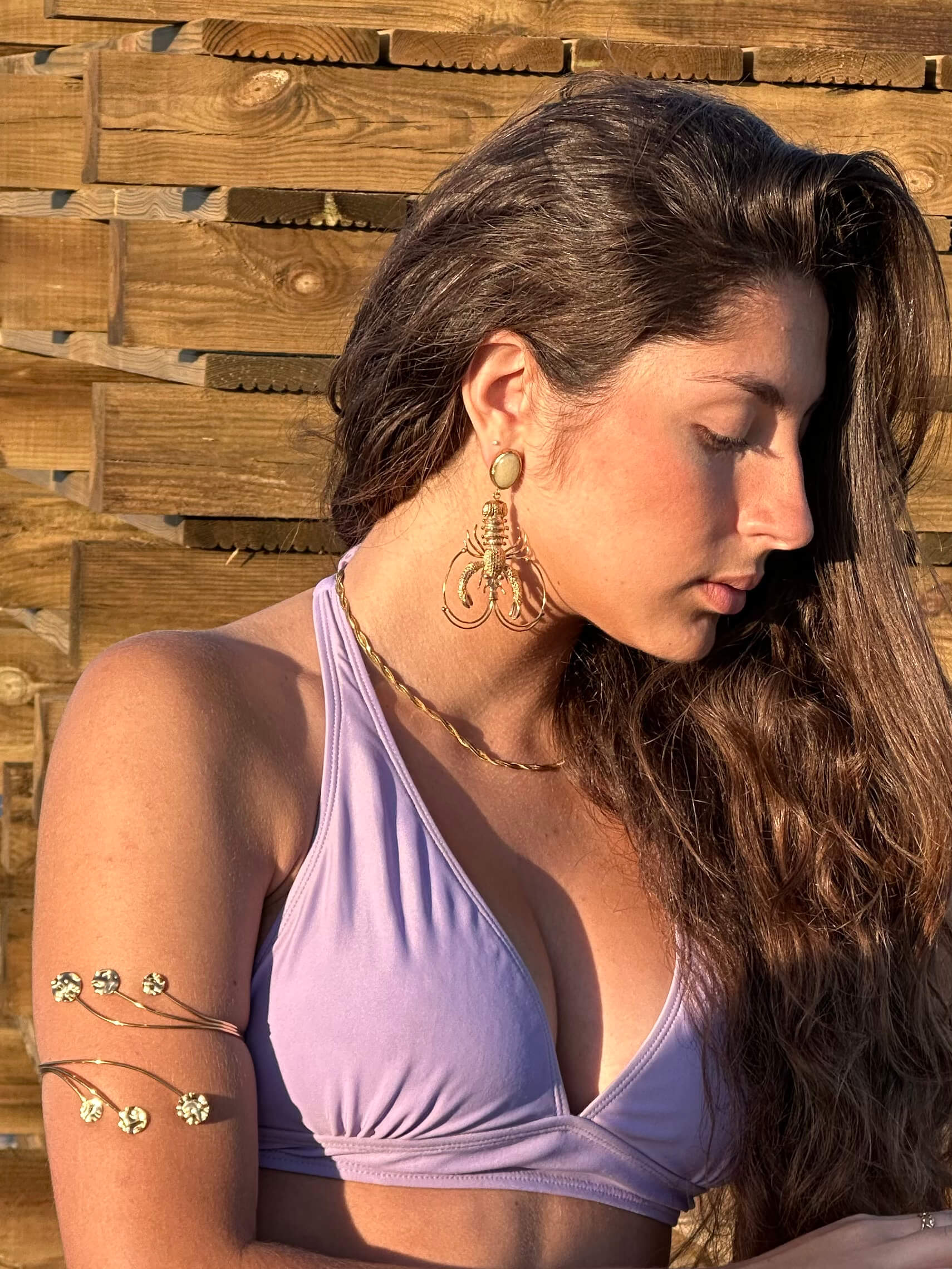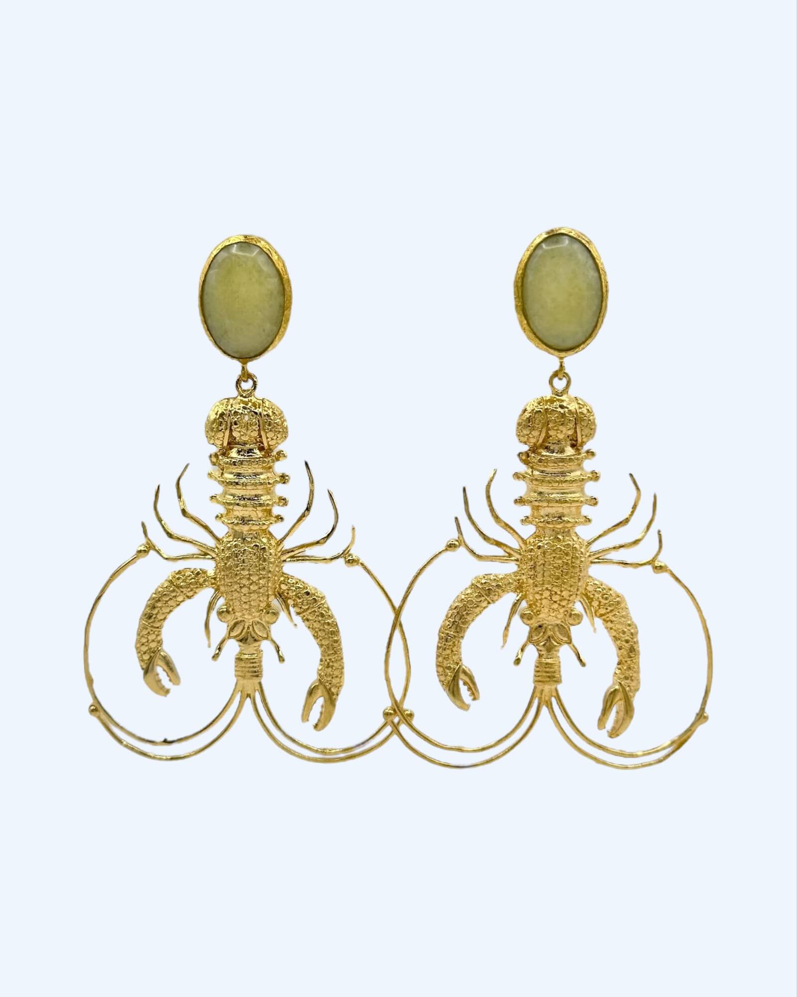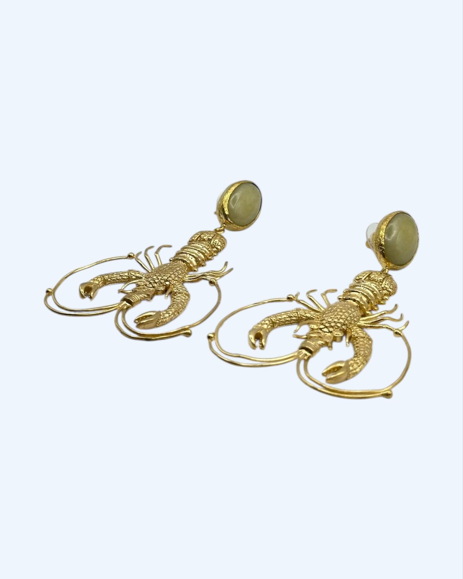 Brincos statement em latão dourado com pendente de lagosta grande e topo em pedra cor oliva. Ousados, cheios de detalhes e perfeitos para dar aquele up em qualquer look de verão, sunset ou after party.