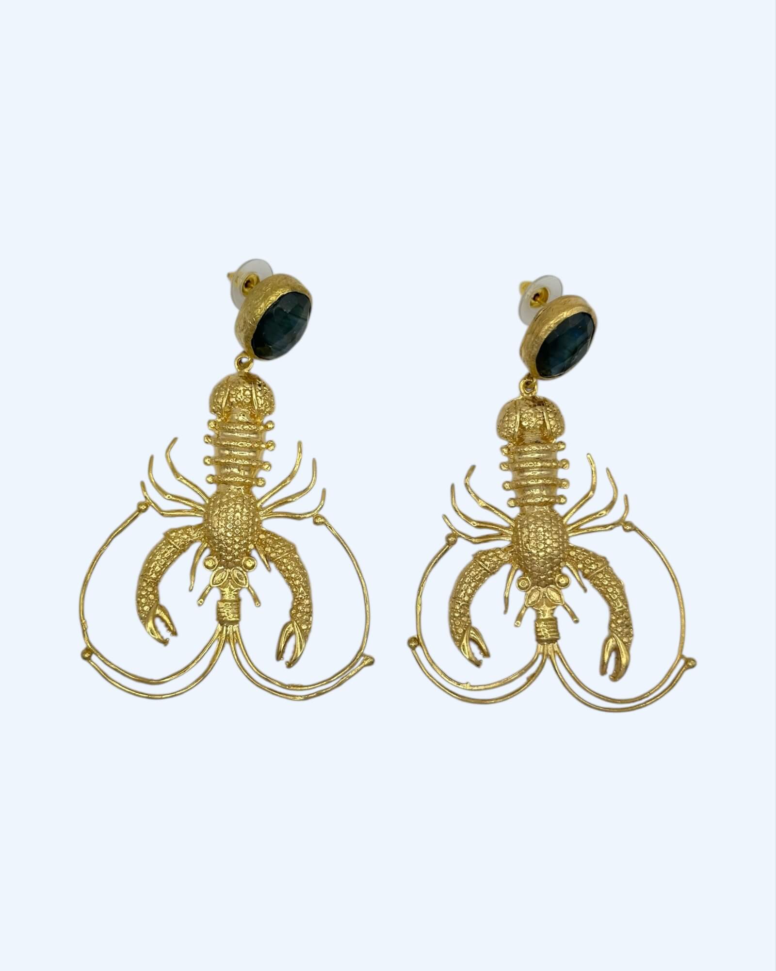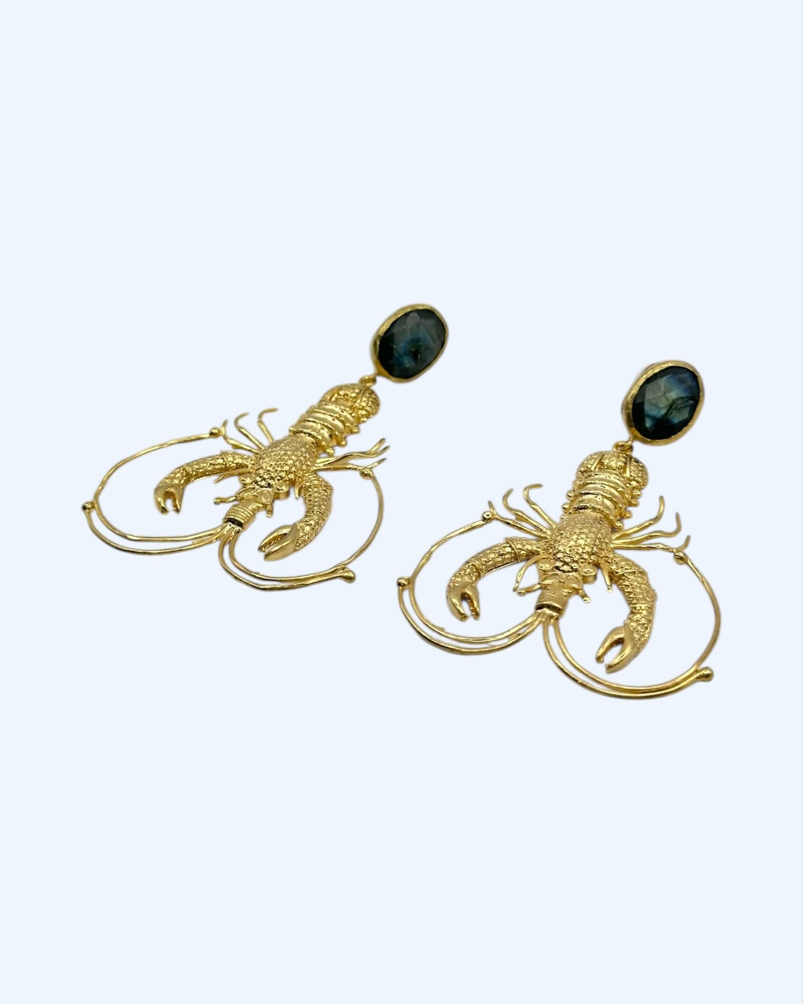 Brincos statement dourados com pendente de lagosta grande texturizada e topo em labradorita. Um brilho azul-esverdeado que evoca o fundo do mar. Feitos em latão, para um look bem POW!