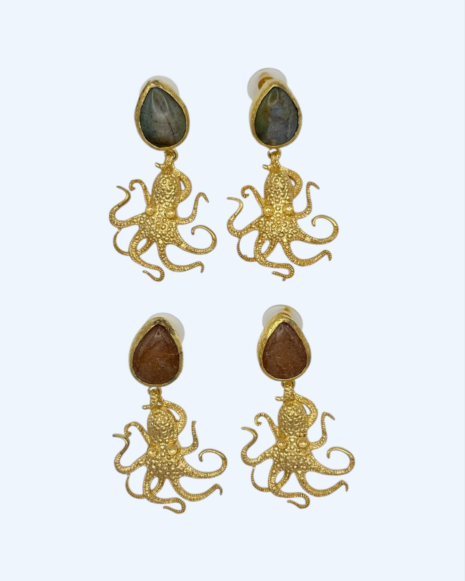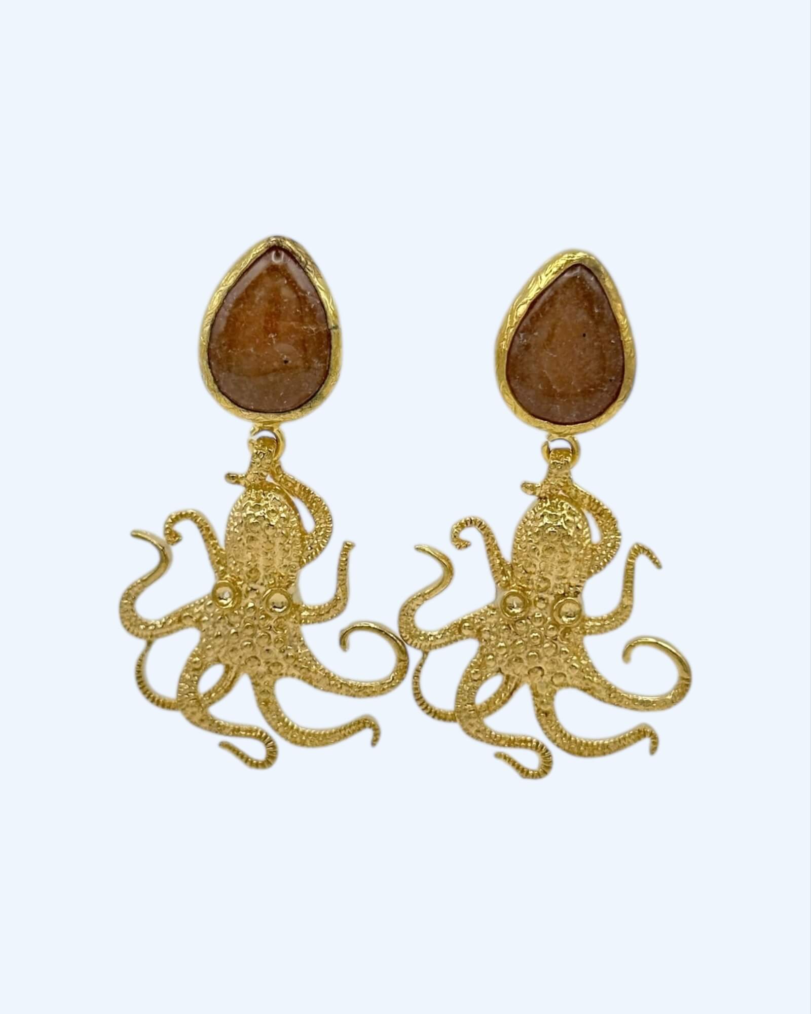 Brincos statement em latão com pendente de polvo e topo em pedra castanho dourado ou verde iridescente. Um toque místico-boho para o teu verão.