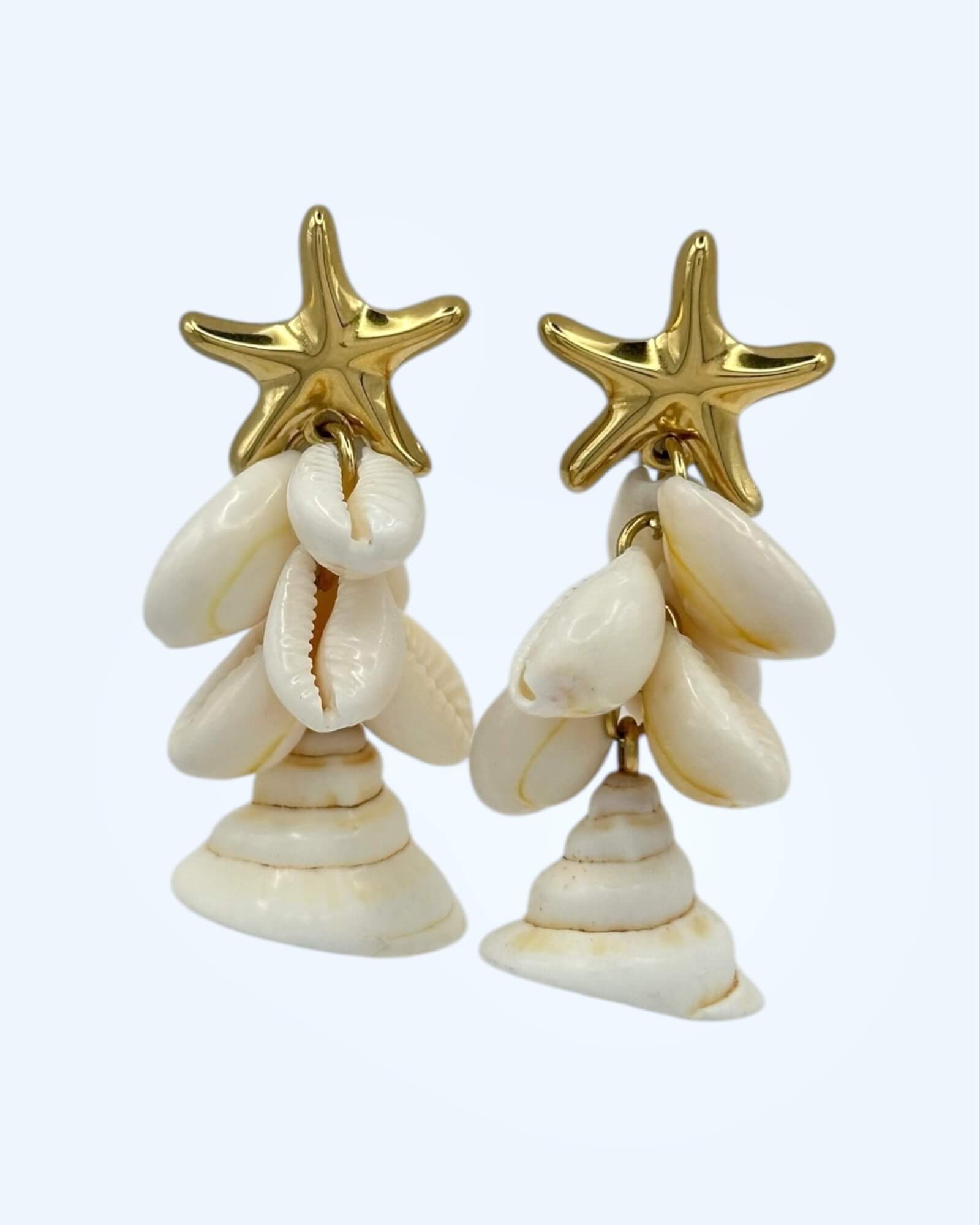 Os mais cutie deste verão! Brincos dourados em aço inoxidável. com topo em estrela-do-mar e pendentes com búzios naturais. Uma fusão perfeita de natural look.