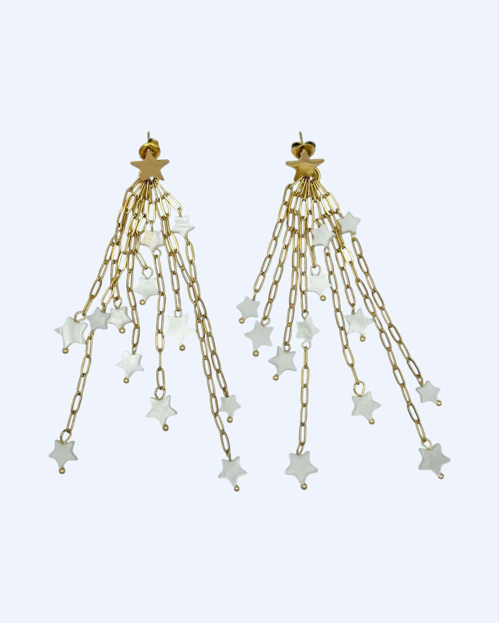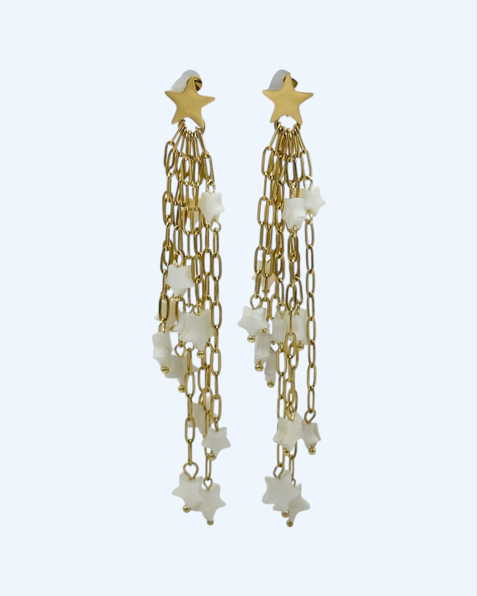 Brincos cósmicos para se moverem contigo. Em aço inoxidável trazem uma estrela dourada no topo e uma cascata de correntes irregulares com estrelas e madrepérola.