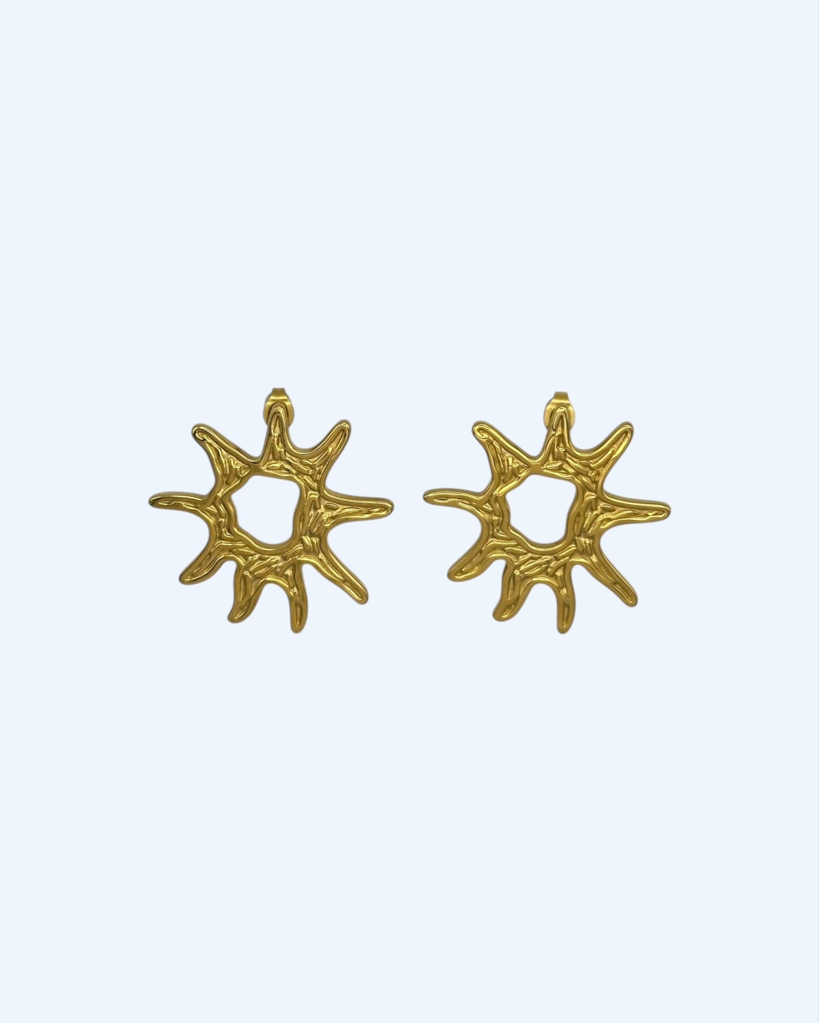 Brincos dourados em formato de sol com design e textura abstratos. Feitos em aço inoxidável, trazem uma energia boho e cool, onde só importa um verão com sol e mar.