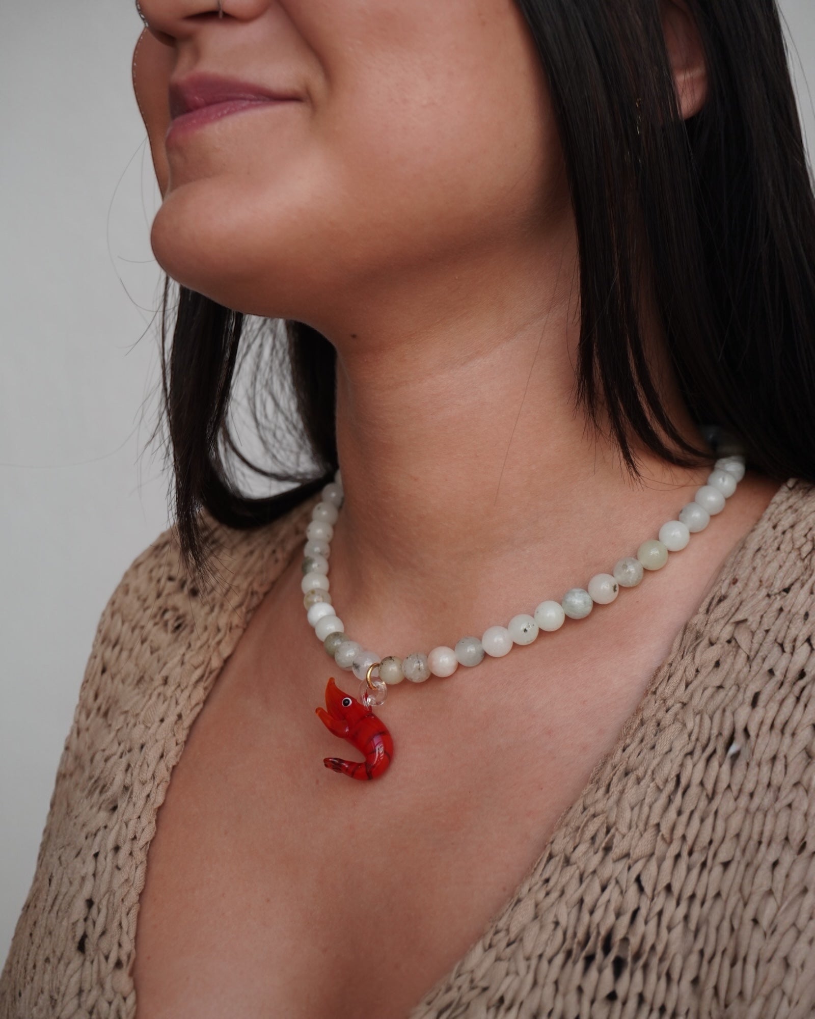 Colar feito á mão com pedras naturais e com um pendente em vidro que rouba a cena. Acabamentos em Aço Inoxidável.