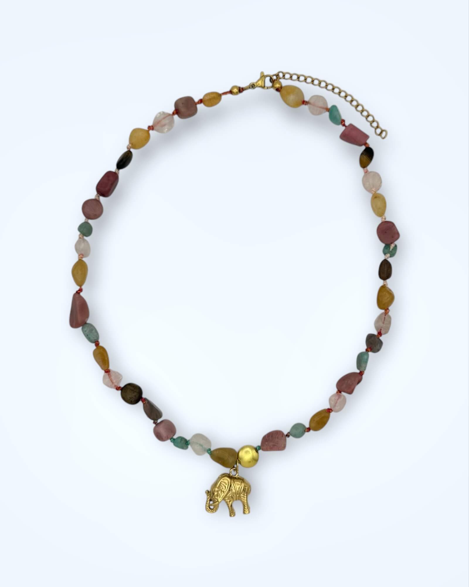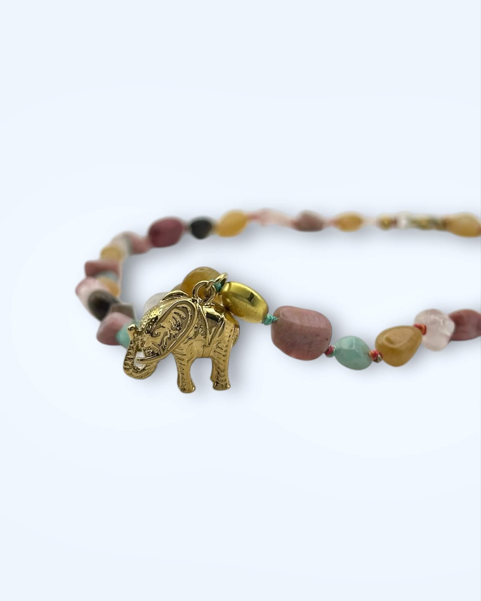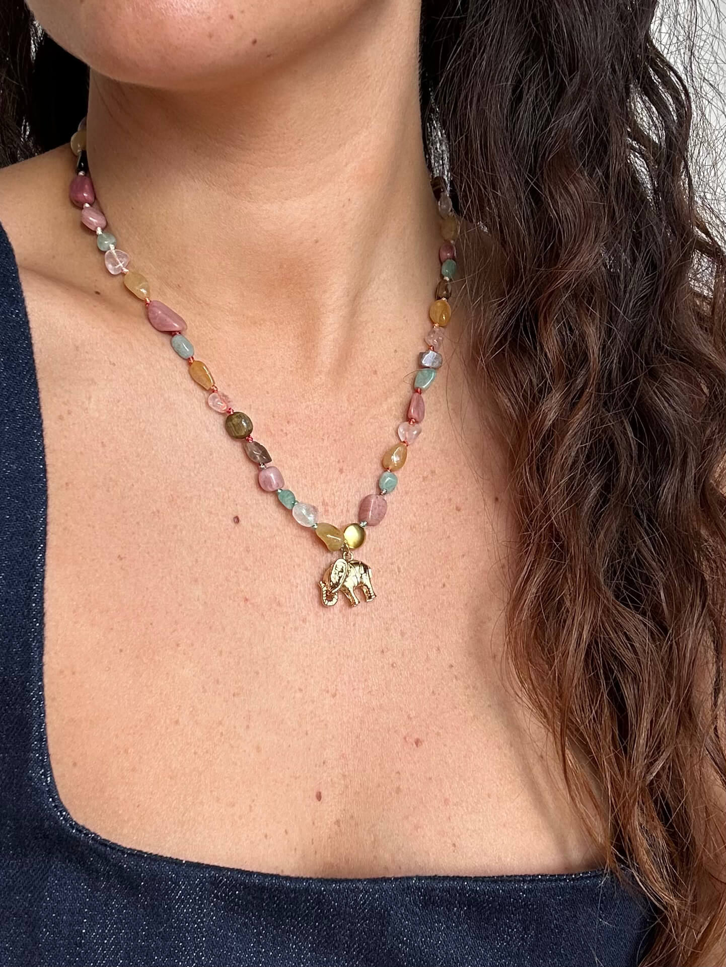 Colar tropical com contas em pedras naturais e pendente elefante dourado em aço inoxidável. Um amuleto boho para vibes a solo ou em mix & match com outros colares.