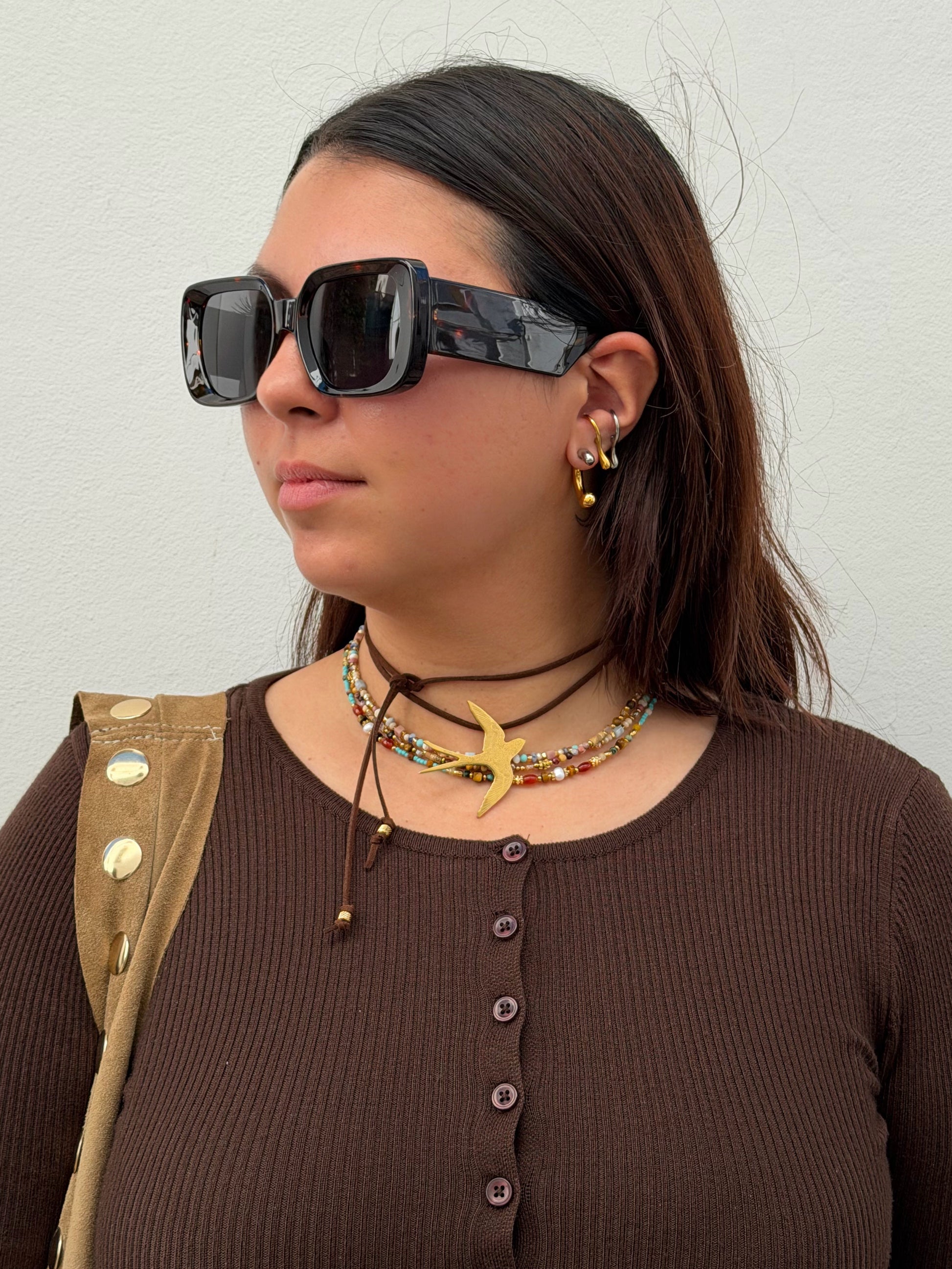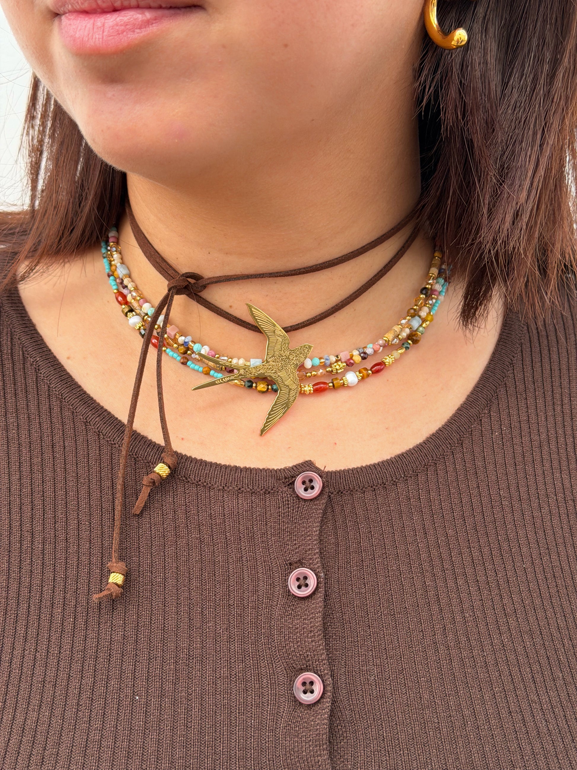 Colar de camurça choker ou longo, com pássaro em aço inoxidável. Disponível em prateado e dourado.