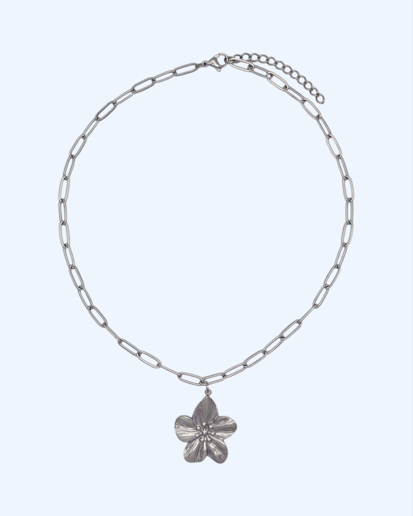 Colar em aço inoxidável com corrente de elos ovais e pingente de flor texturizada. Um toque fresh e de leveza que transforma qualquer look. Disponível em dourada e prateado.