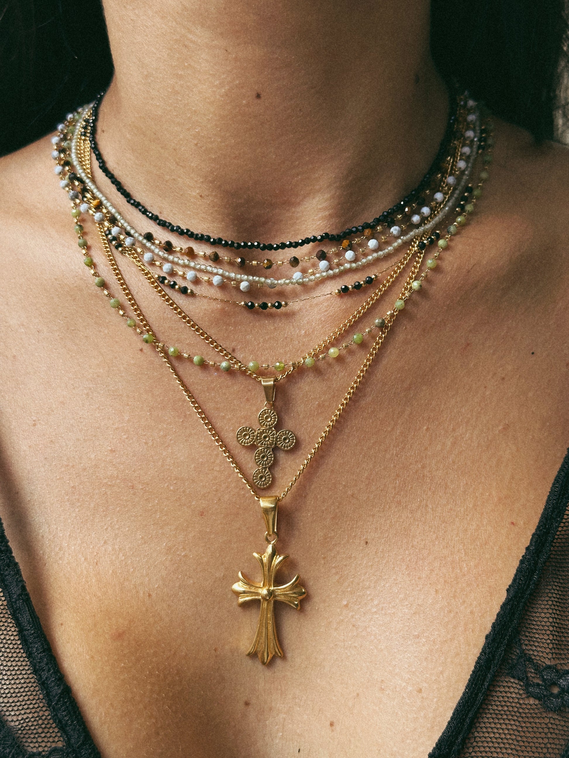 Classyyy também para layering. Colar em corrente fina dourada com zircónias facetadas com fecho em aço inoxidável. Disponível em várias cores.