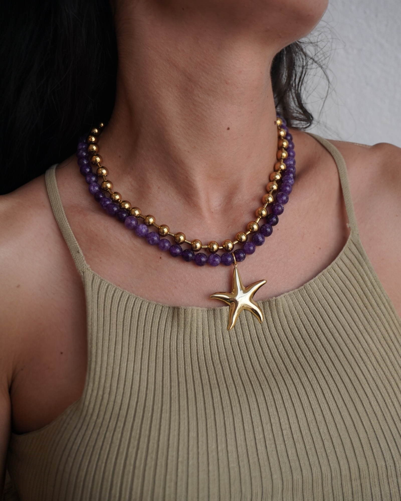 Colar feito á mão com pedras naturais. Pendente estrela e terminações em Aço Inoxidável.