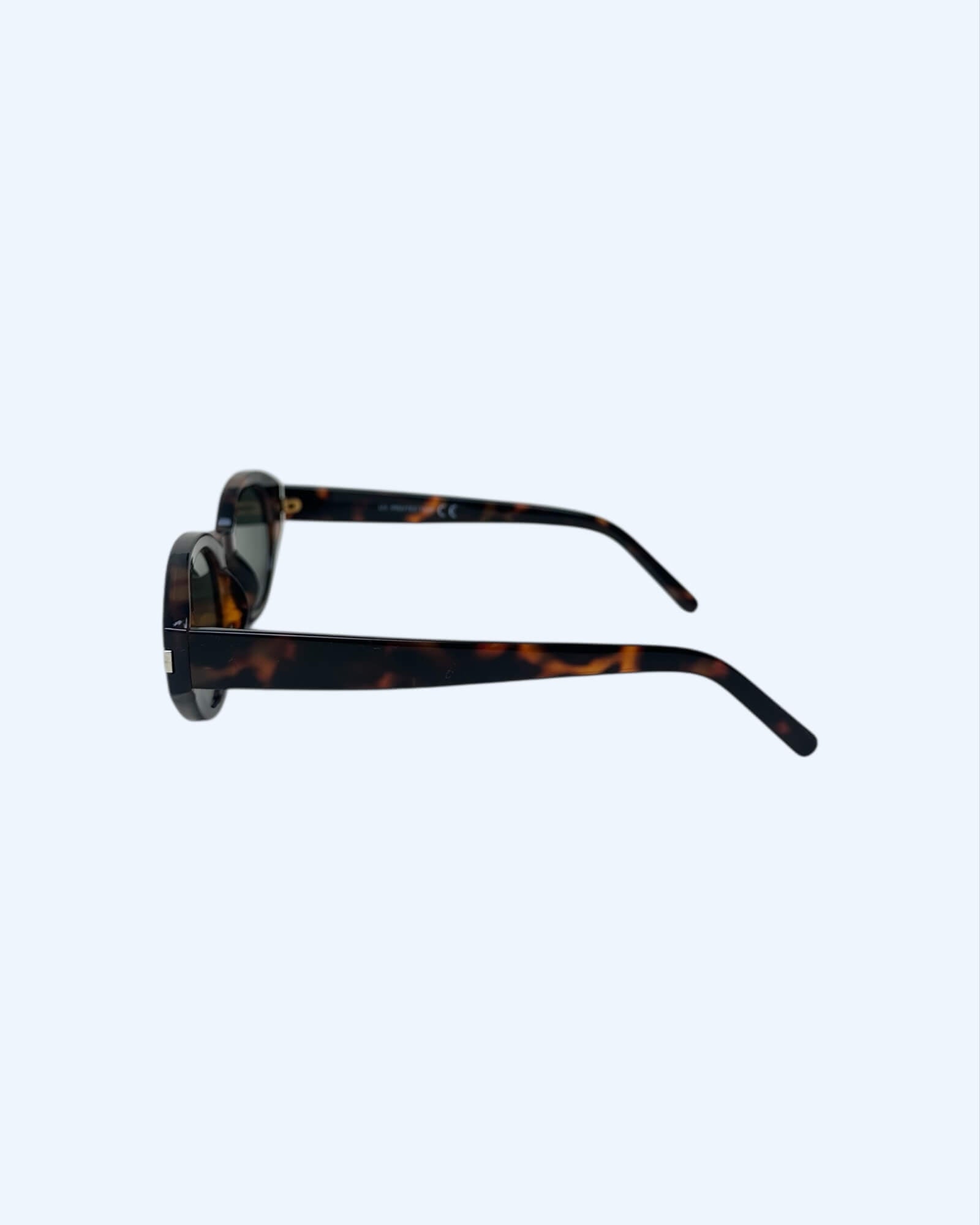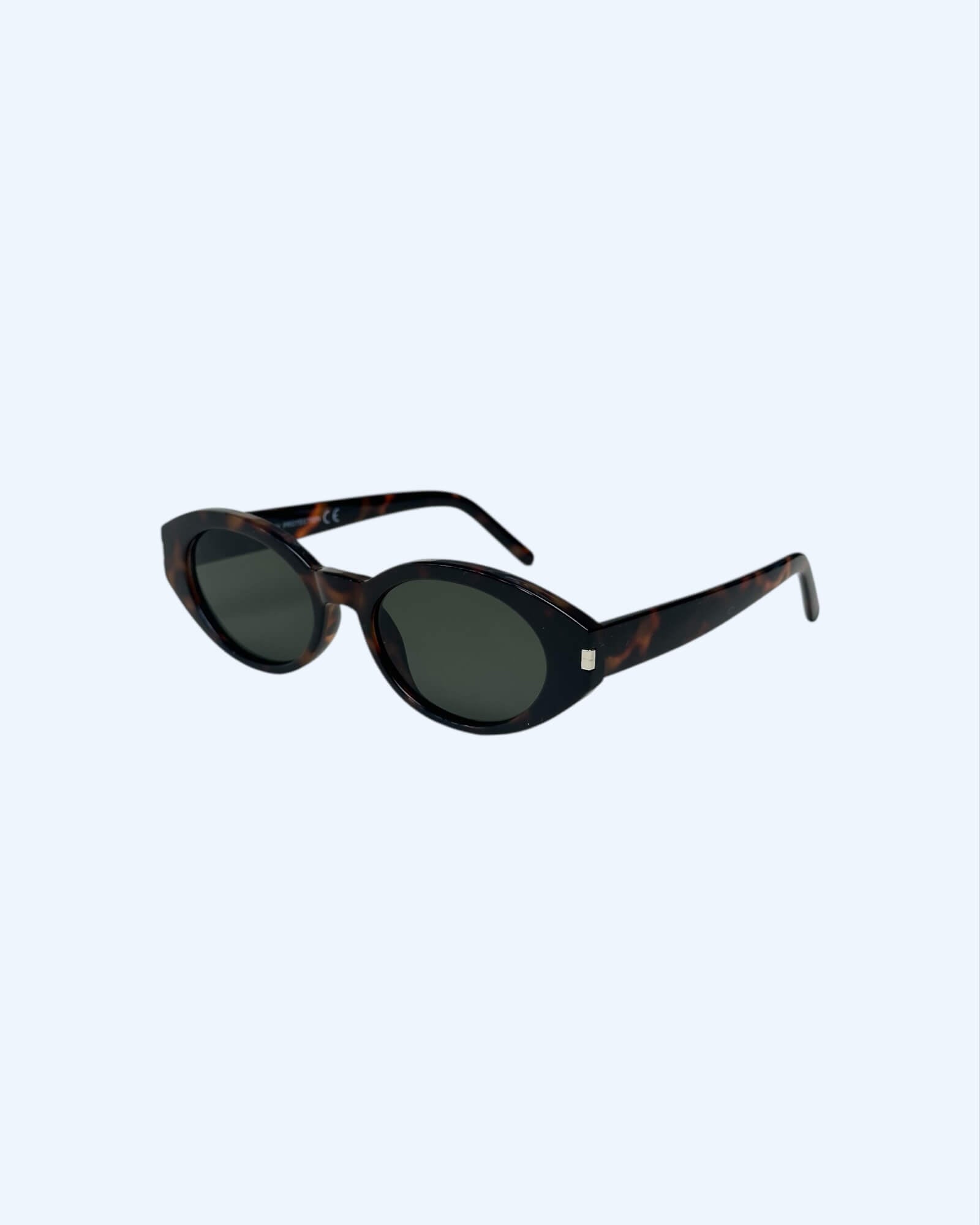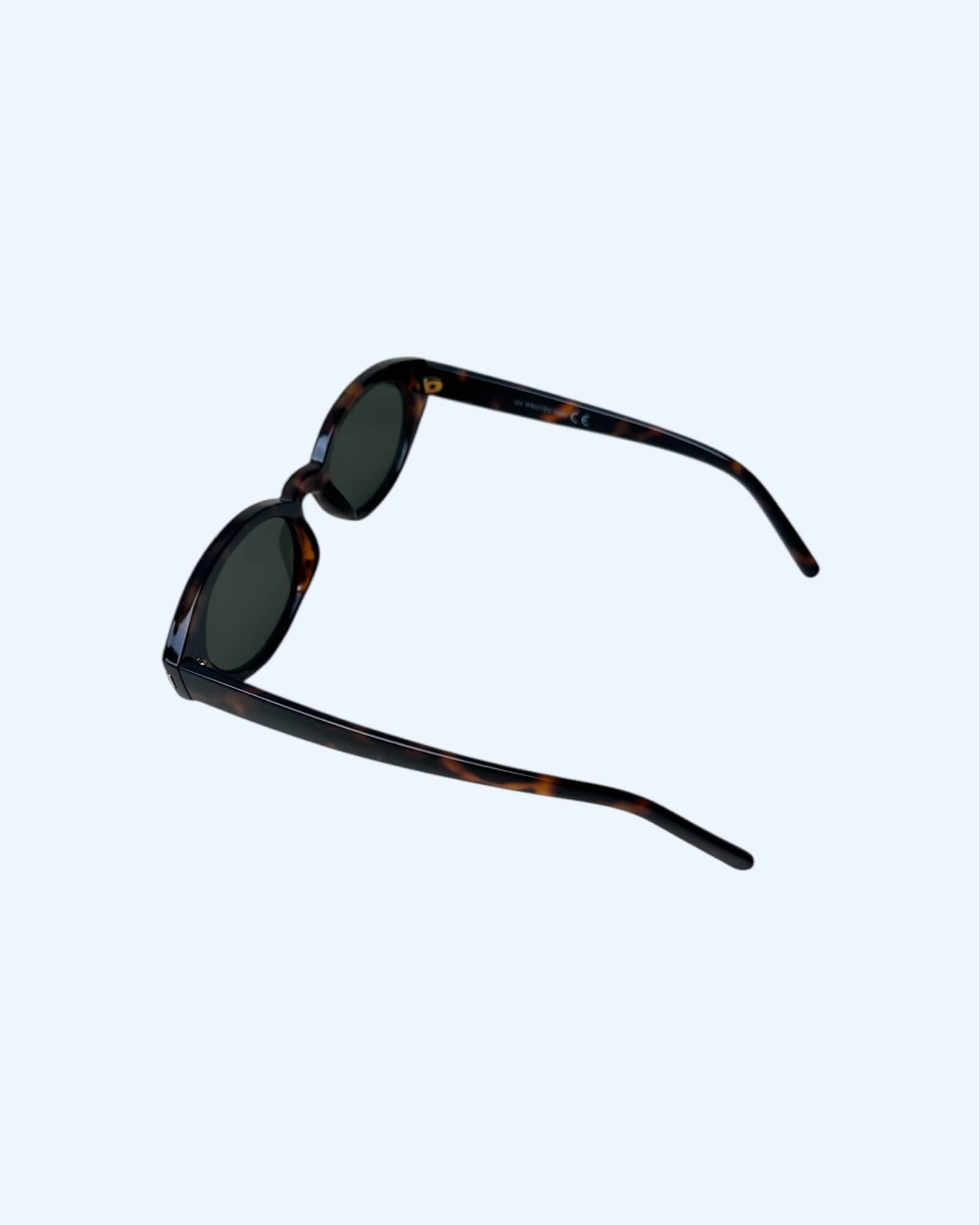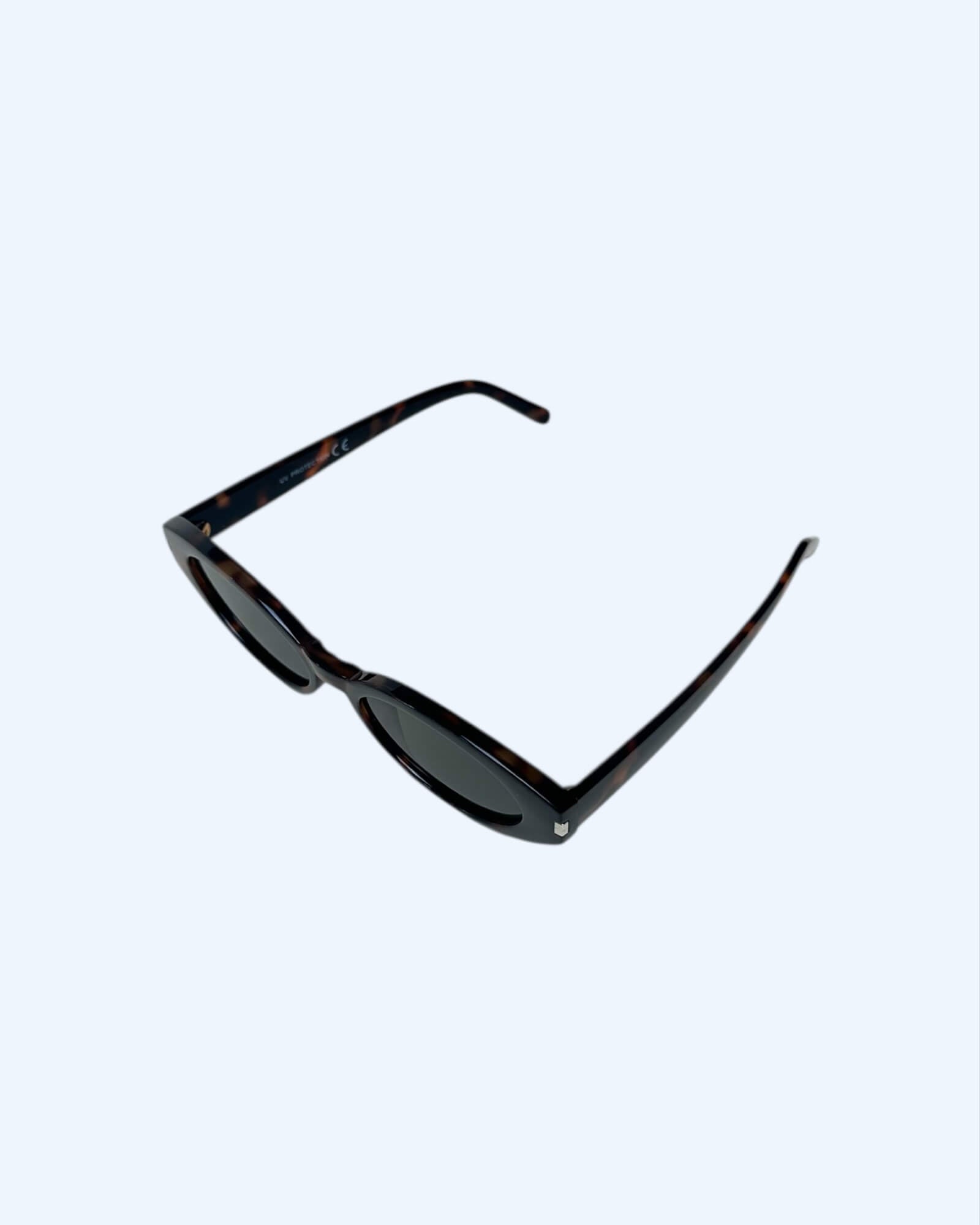 Vintage com um toque glam sóbrio. Os óculos Lana são o match perfeito entre o clássico cat eye e detalhes trendy: armação tartaruga afilada com acabamento metálico dourado nas hastes e lentes castanhas fumadas.