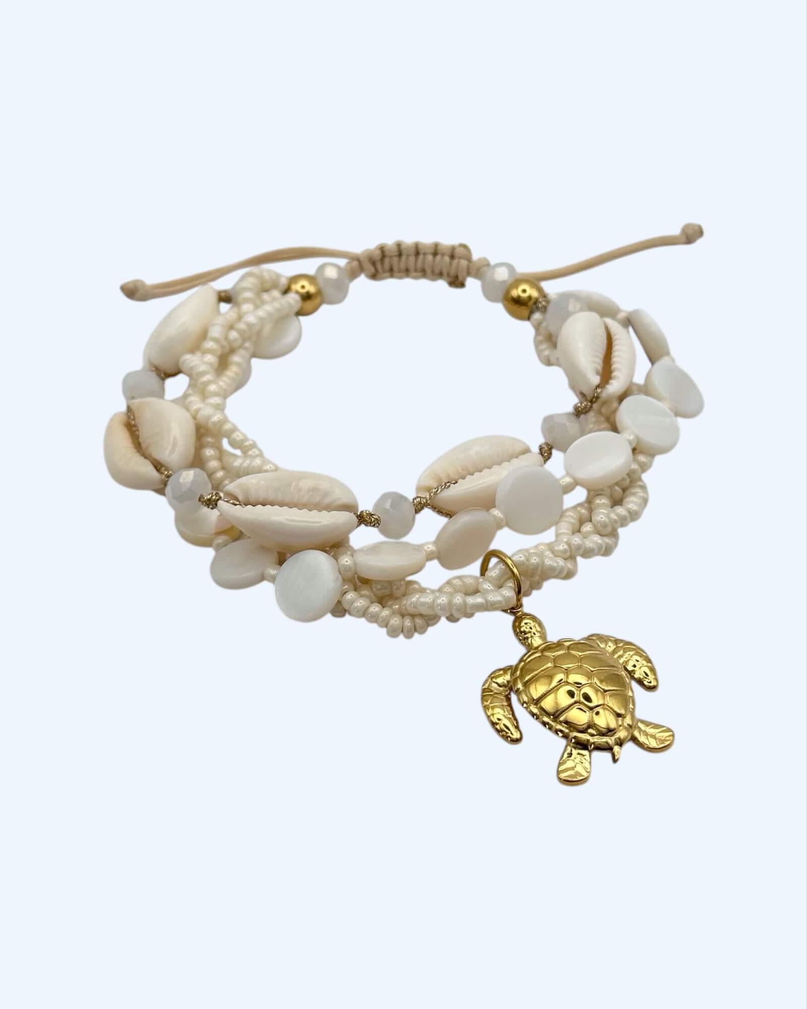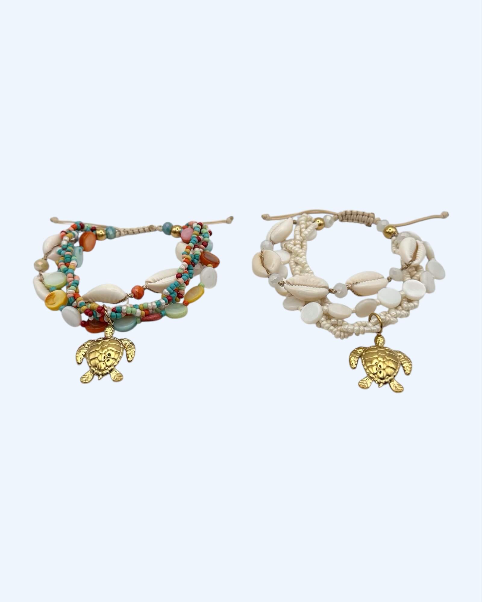 Pulseira boho ajustável com pendente de tartaruga dourada em aço inoxidável. Combina búzios e contas coloridas ou de tom natural. São duas versões vibrantes e tropicais perfeitas para o verão.