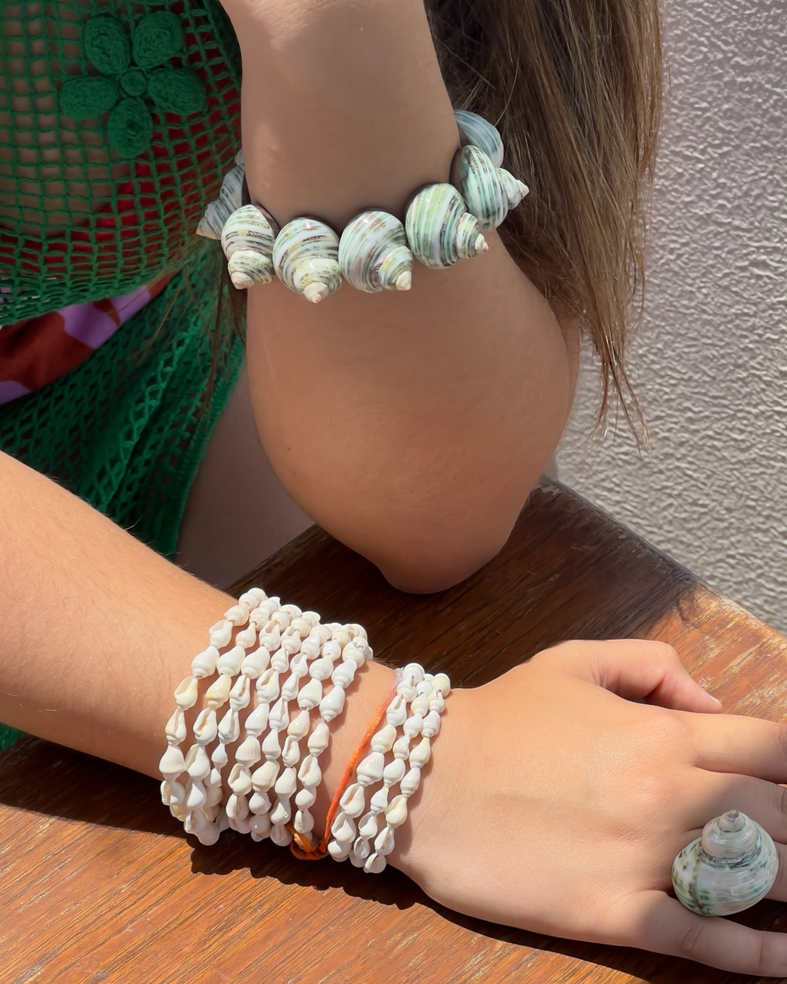 Pulseria com fio elástico de espirais cónicas e texturas marmoreadas em tons de verde. Esta pulseira em búzios naturais traz uma energia perfeita para quem vibra com a natureza e o lado mais edgy do estilo boho.