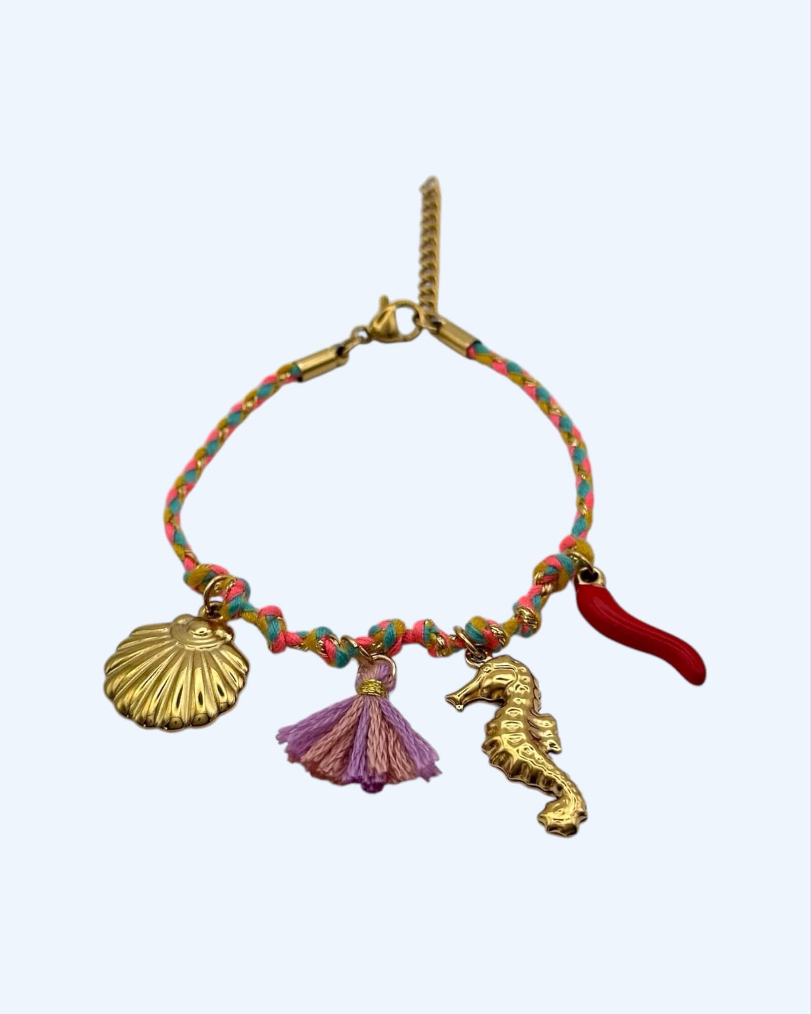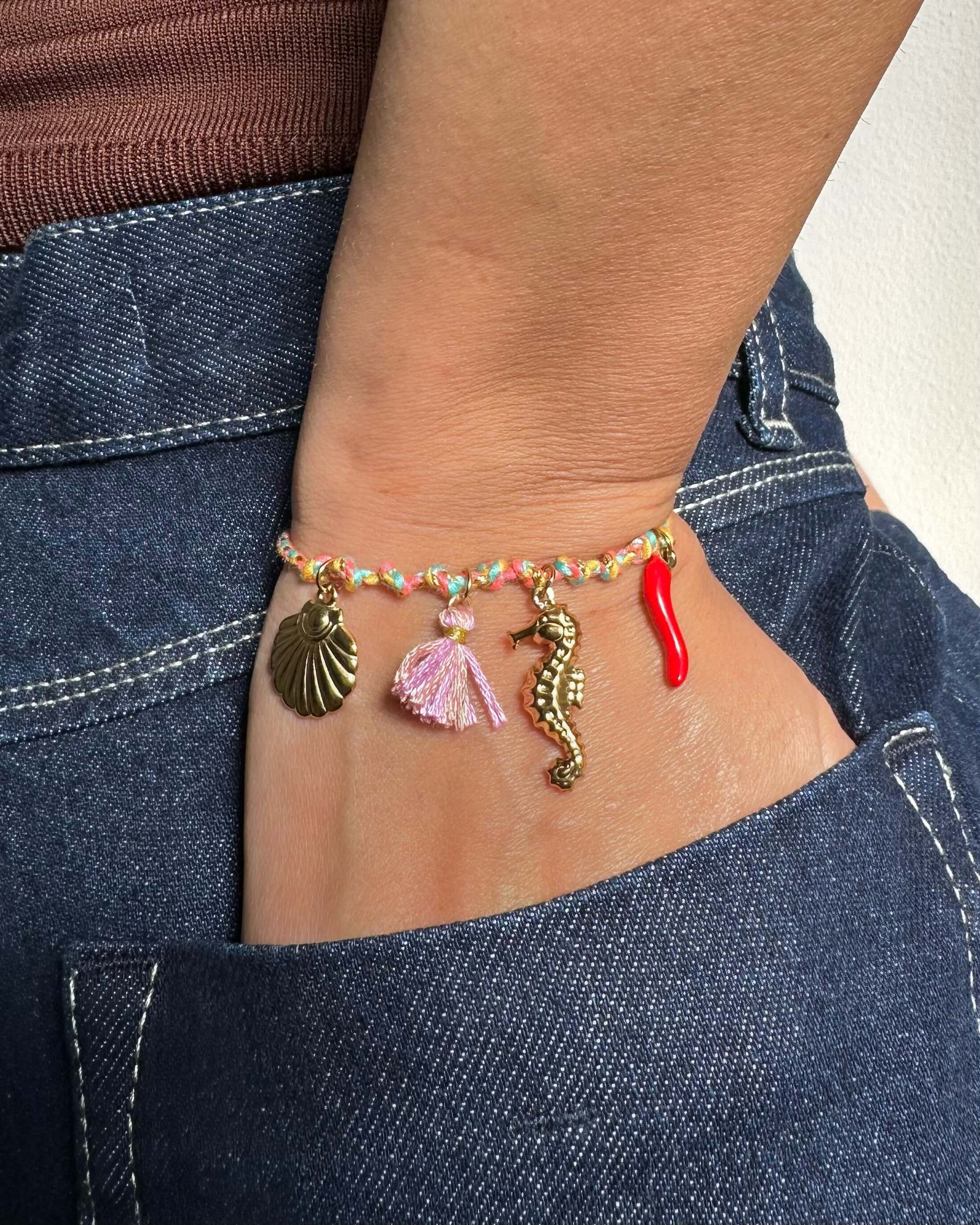 Cheia de cor, com um mix de charms em concha, cavalo-marinho e malagueta em aço inoxidável, esta pulseira traz em si o verão.