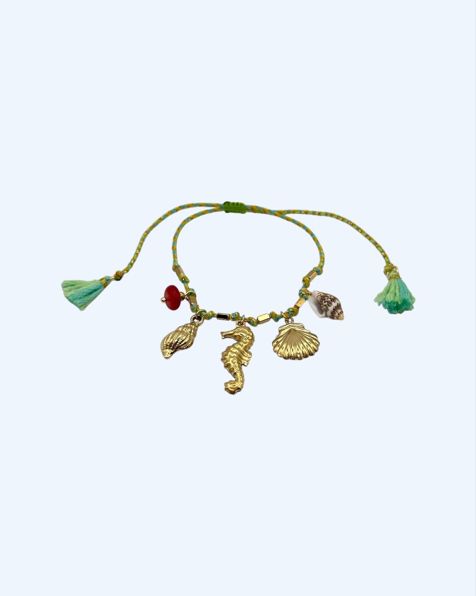 Pulseira com cores que apetece no verão e pendentes de cavalo-marinho, búzio e concha em aço inoxidável dourado, com o detalhe de um búzio natural.