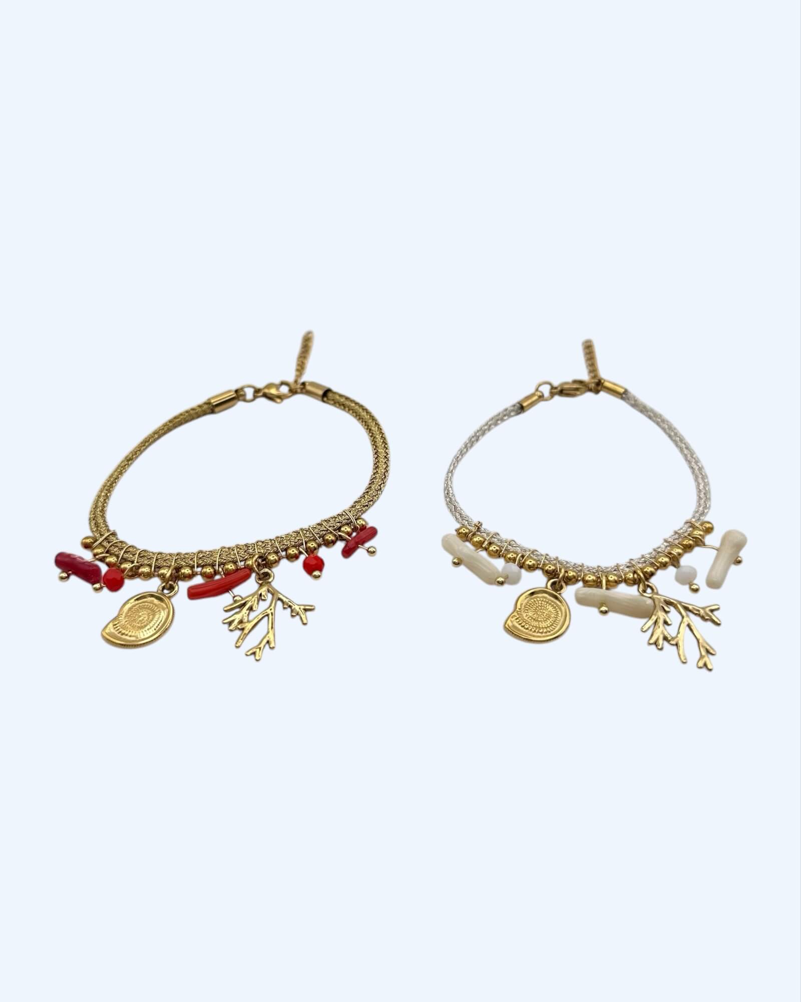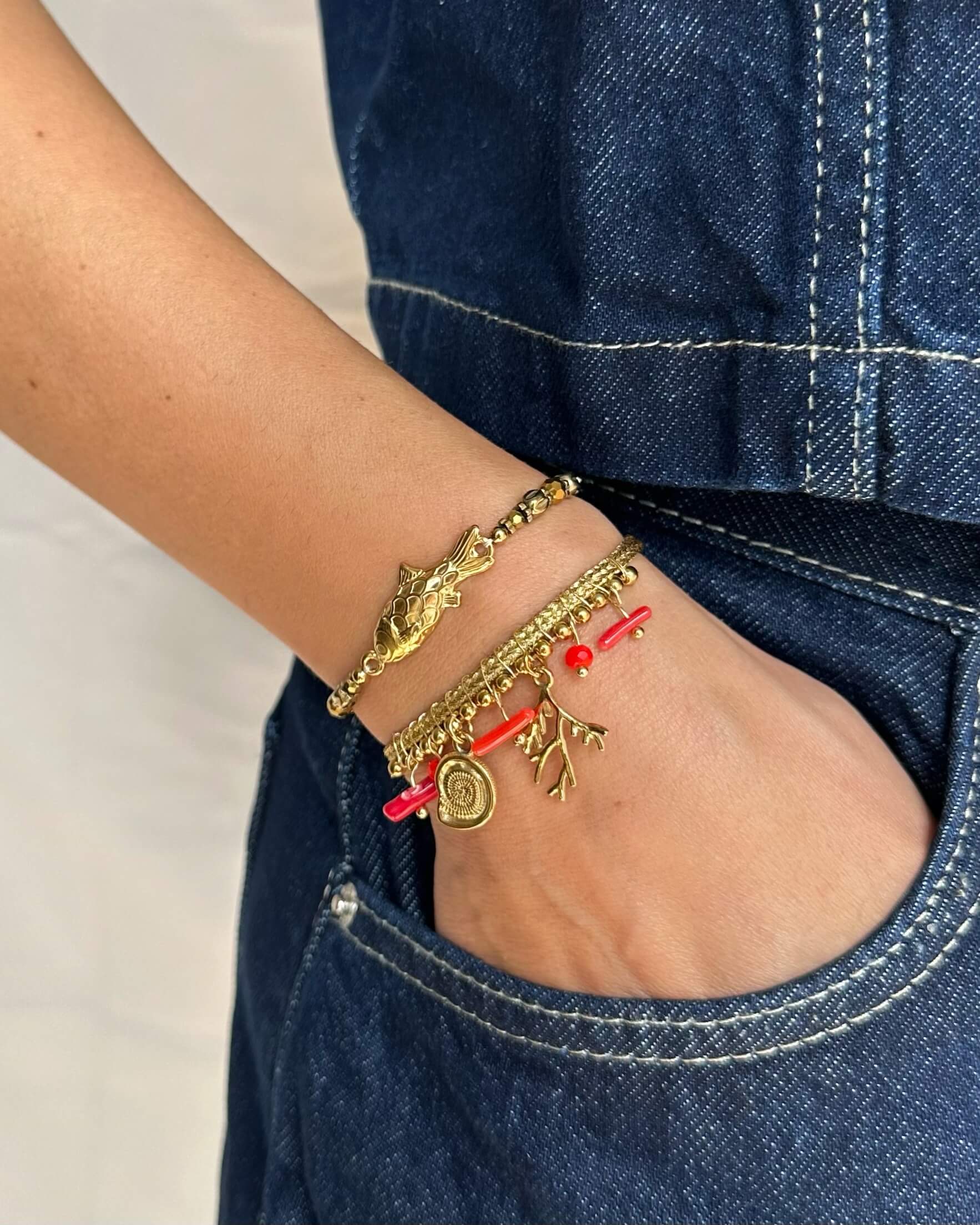Pulseira com malha metalizada e detalhes do fundo do mar, disponível nas cores vermelho-coral ou tom natural, com pendentes dourados em aço inoxidável. Uma pulseira cheia de detalhes.