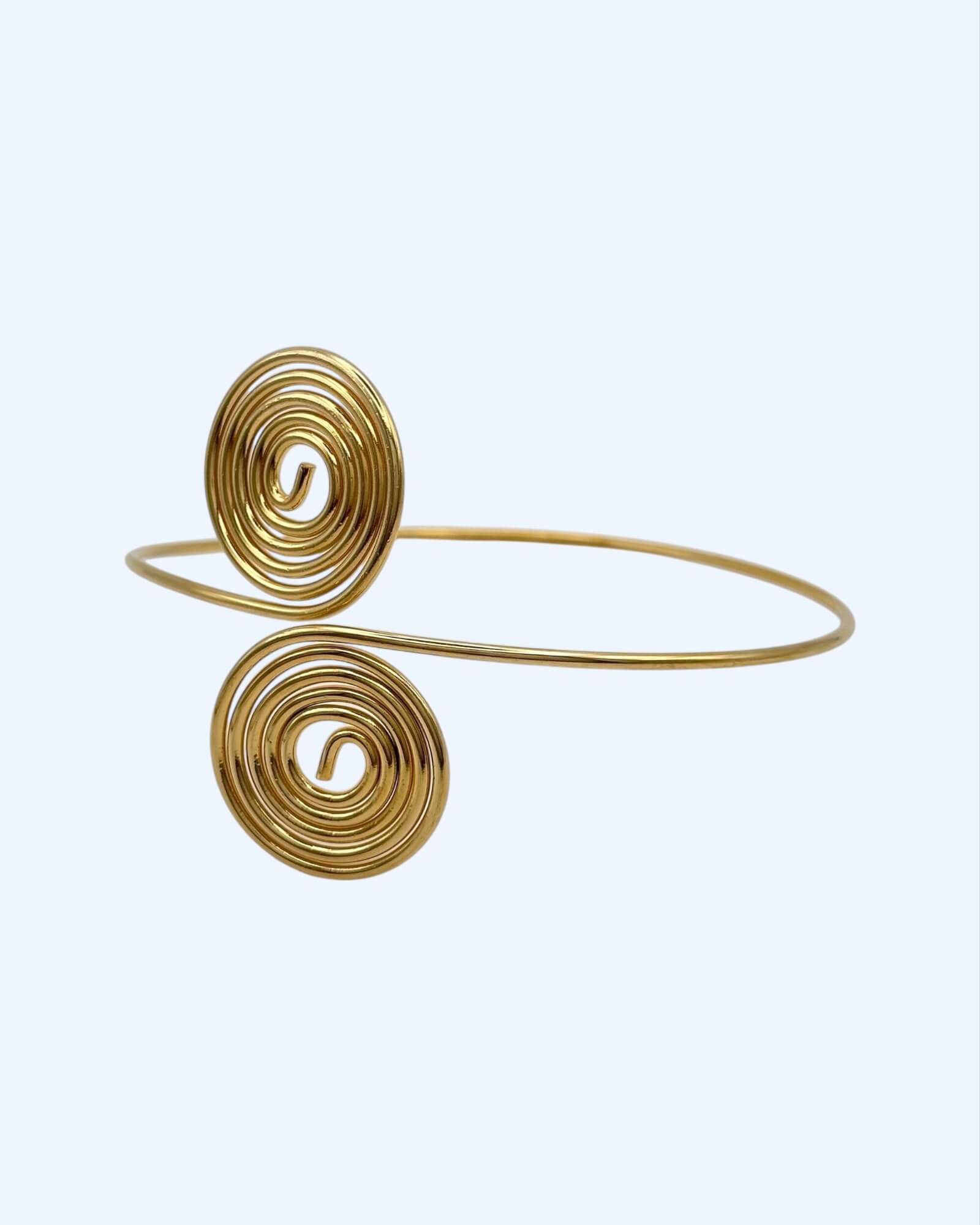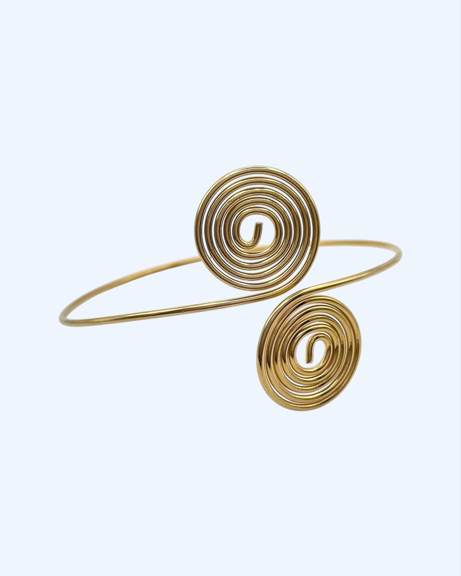 Gostamos de detalhes inusitados, é o caso desta pulseira de antebraço com espirais dourada em aço inoxidável. É de tamanho ajustável.