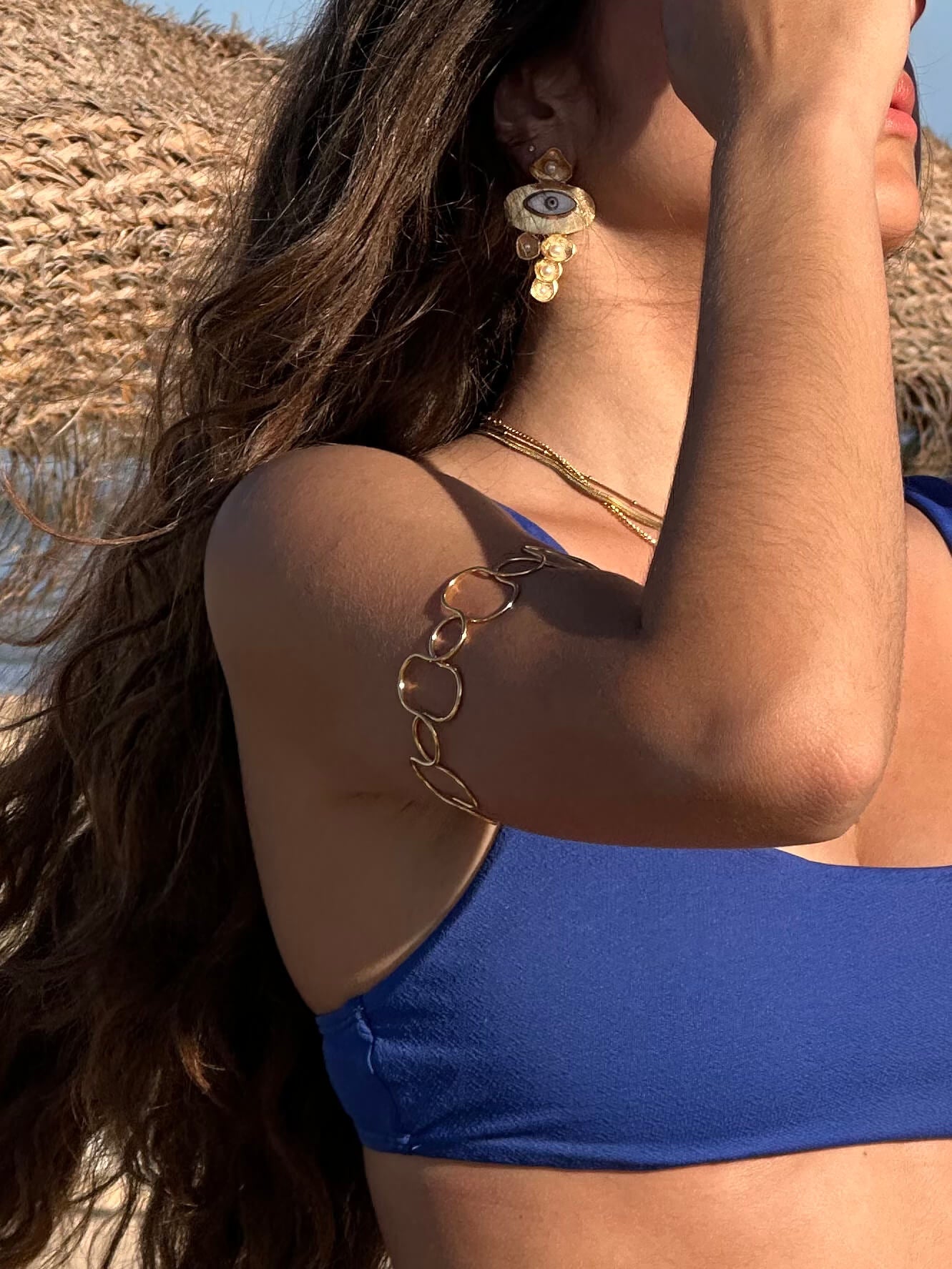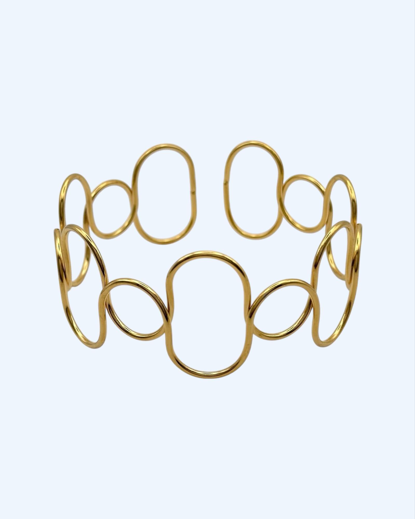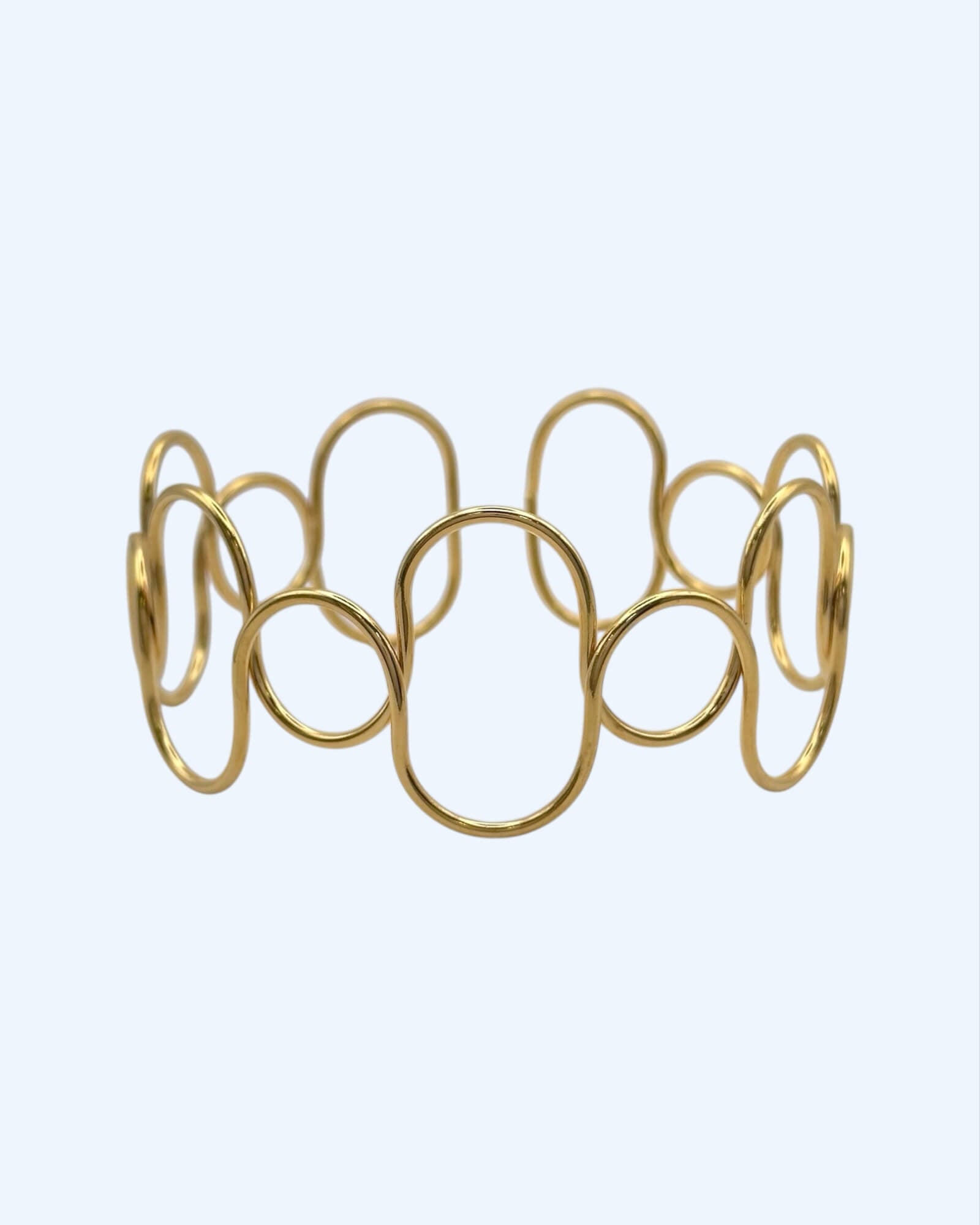 Com formas fluidas ovais e circulares, com uma vibe entre o boho e o art déco, esta pulseira de antebraço dourada é escultural, mas leve, ajustável e em aço inoxidável.