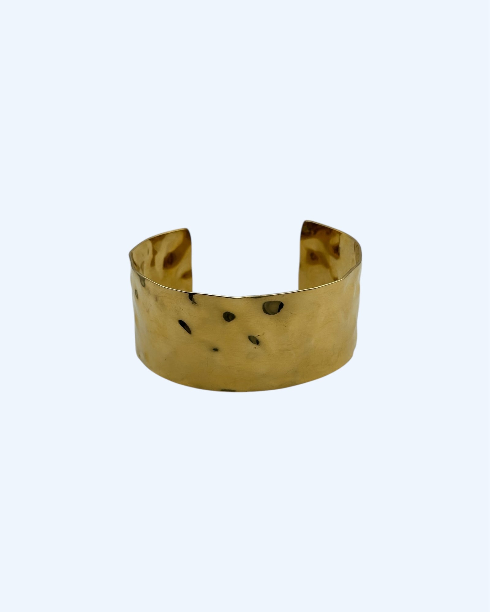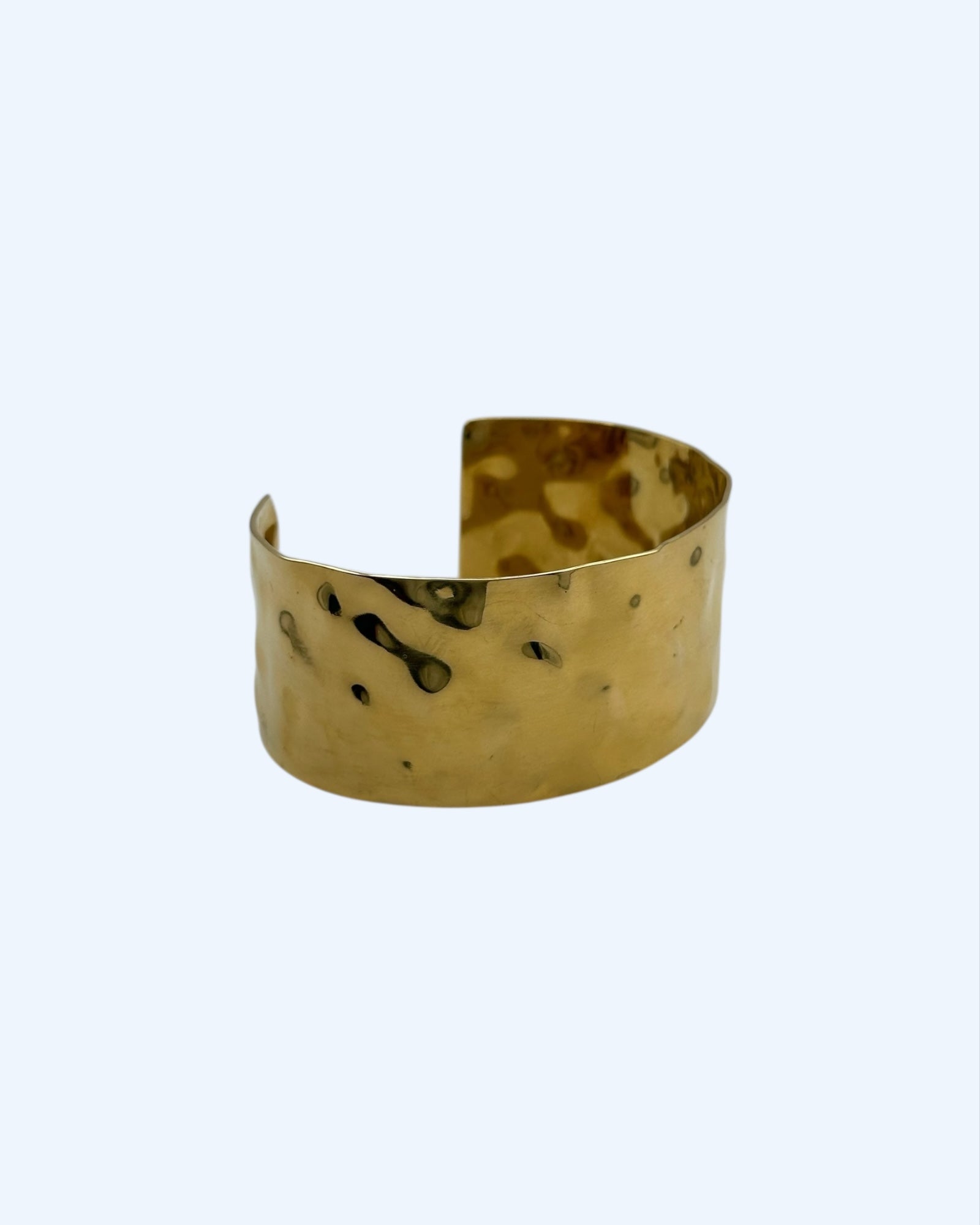 Minimal com impacto máximo. Esta pulseira em aço inoxidável dourada tem textura martelada e shape largo que abraça o pulso com atitude e estilo.