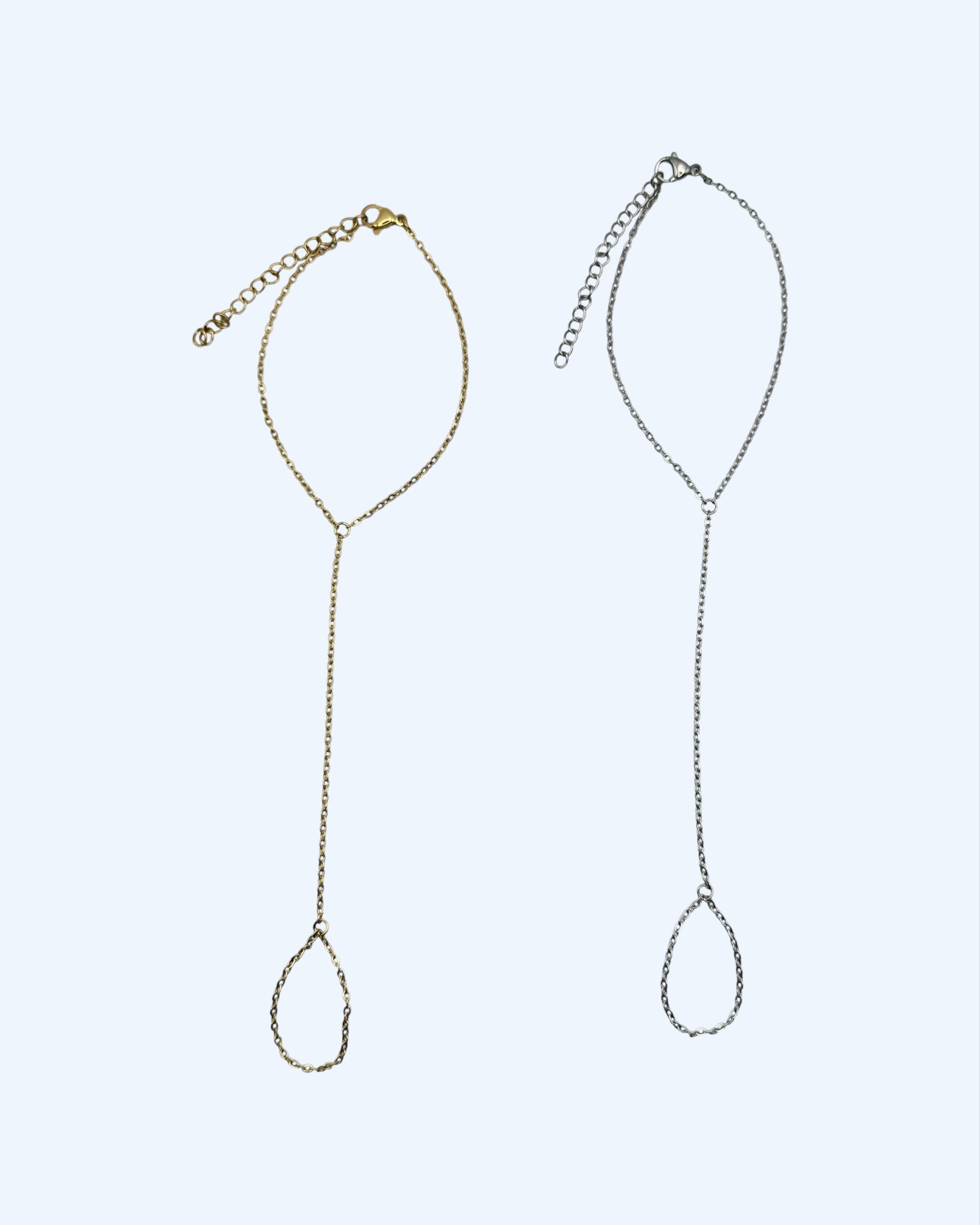 Pulseira fina para a mão, disponível em dourado e prateado.