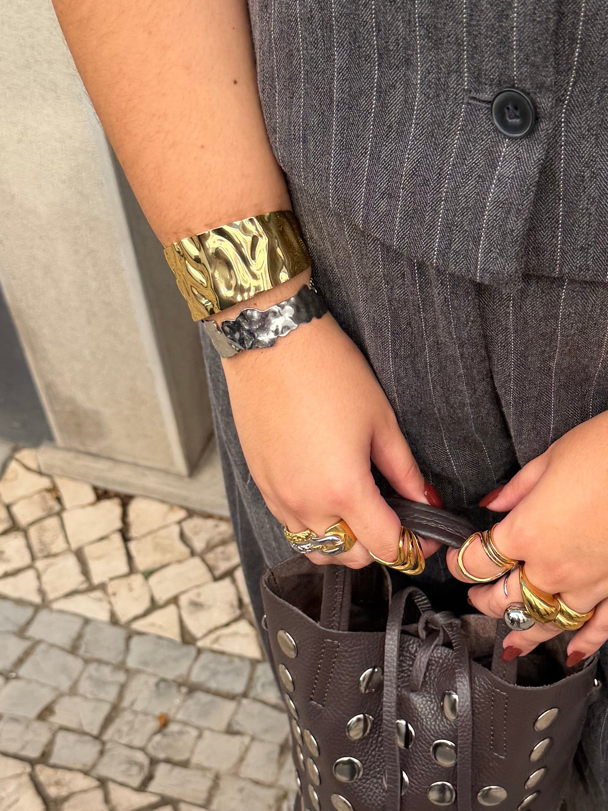 Com contornos fluidos e textura, esta pulseira em aço inoxidável ajustável é super leve e a expressão máxima do cool com um toque de escultural.