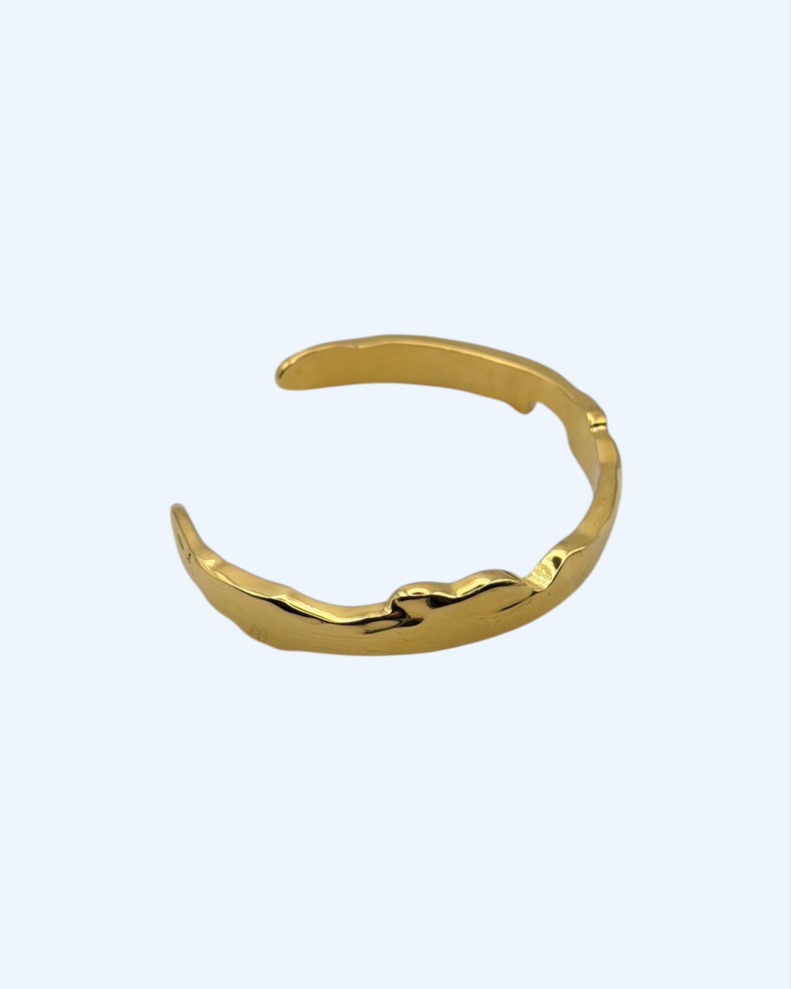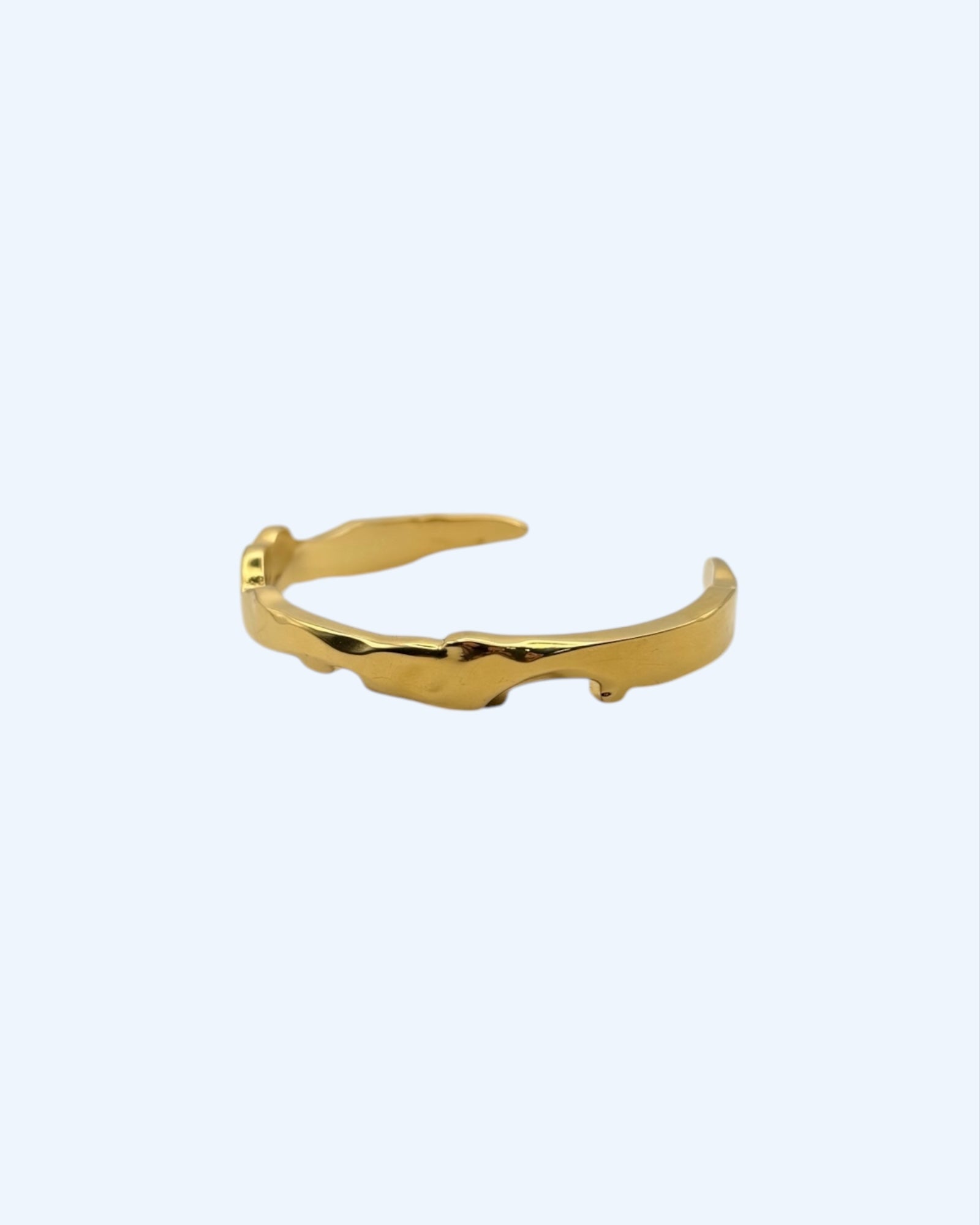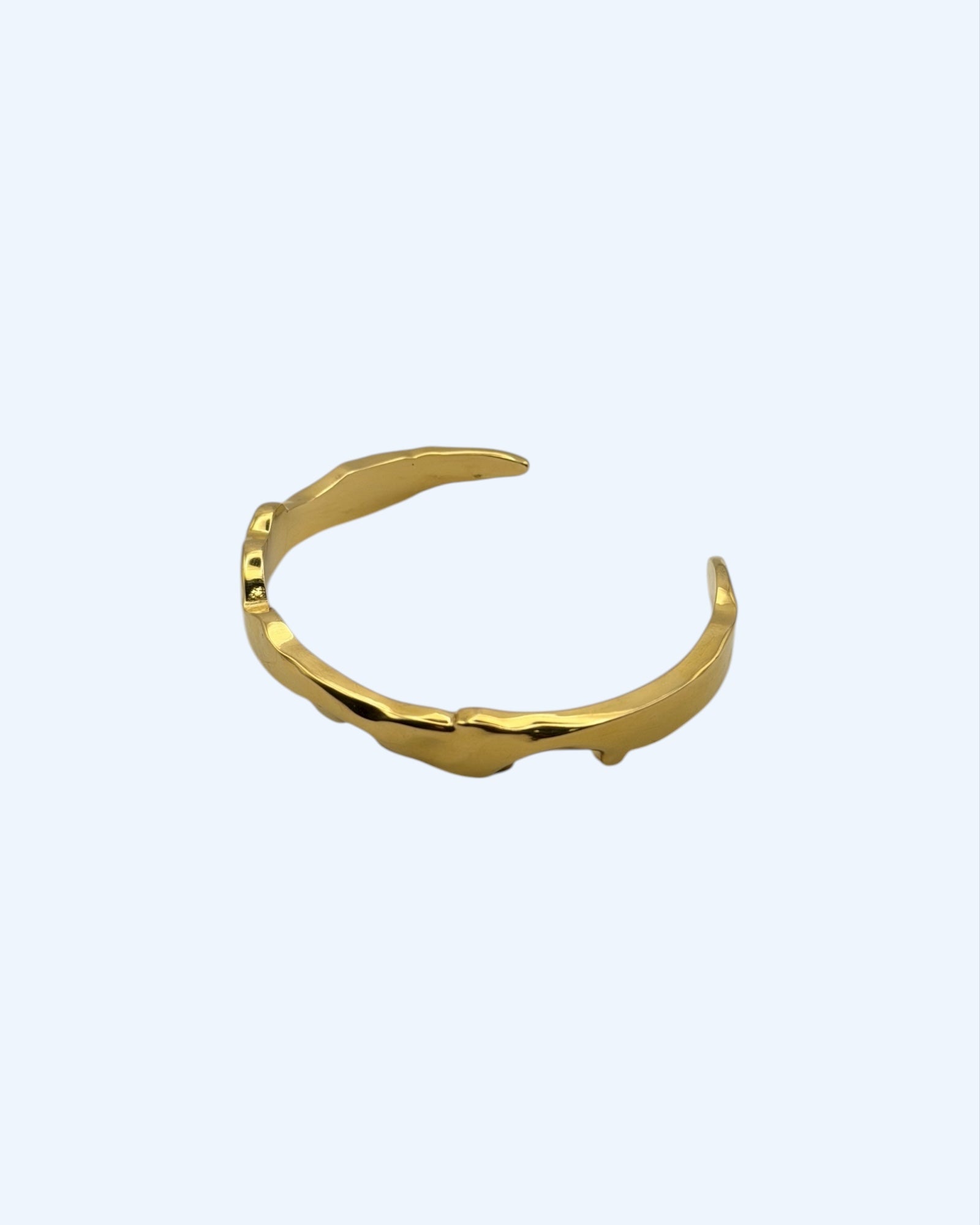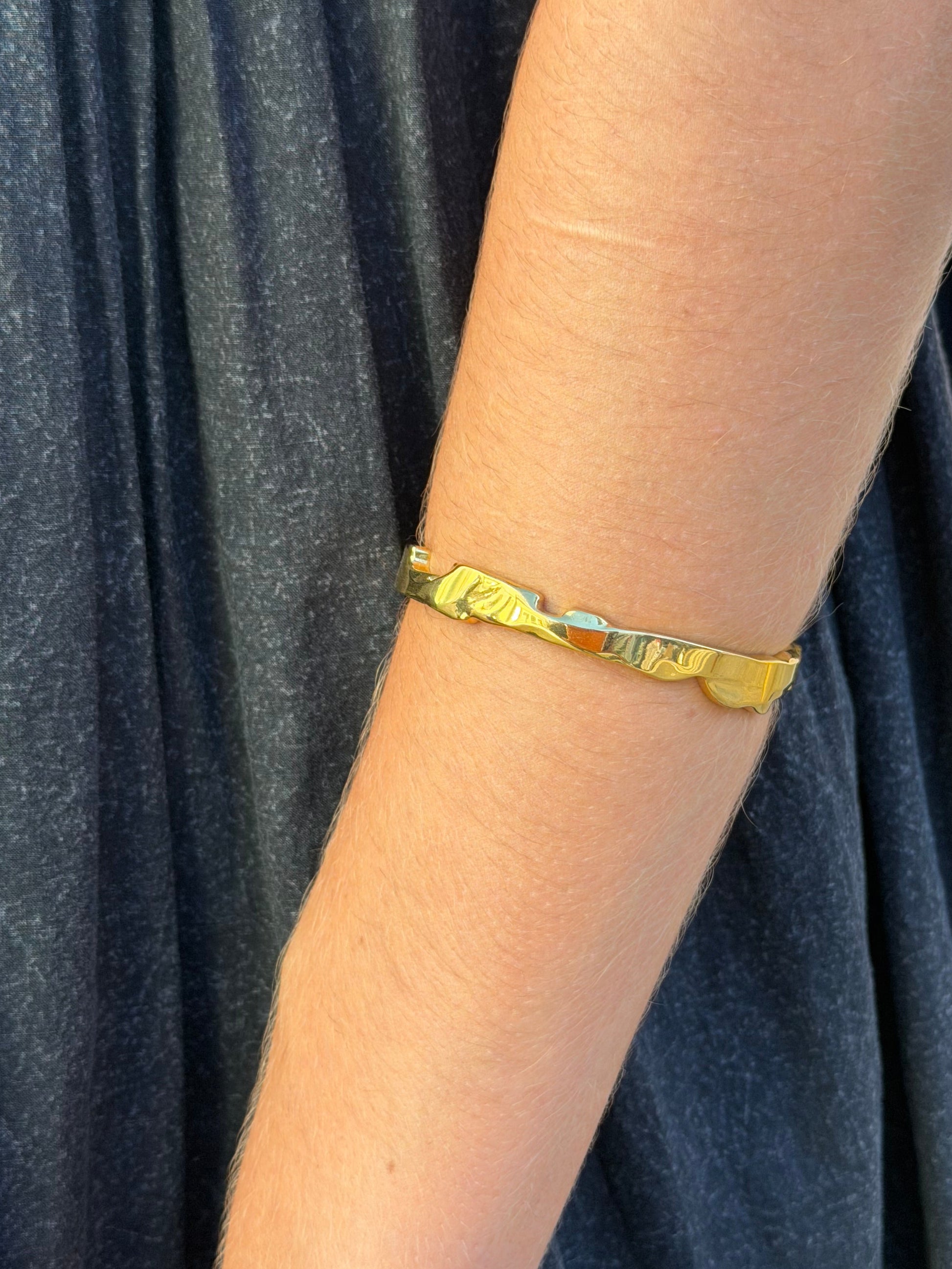 Parece simples, mas até sozinha é perfeita. Pulseira rígida dourada em aço inoxidável.