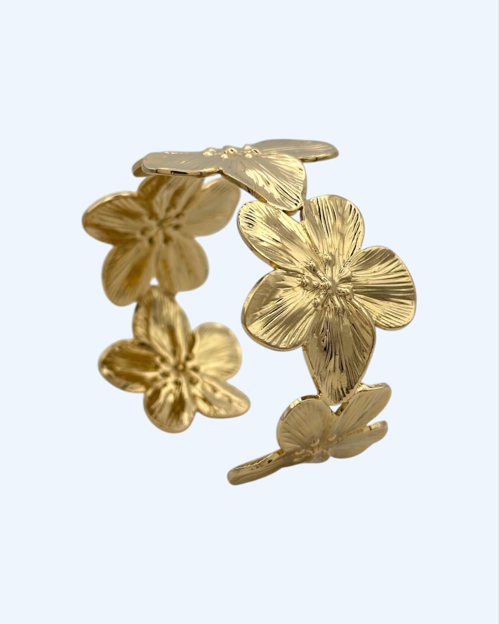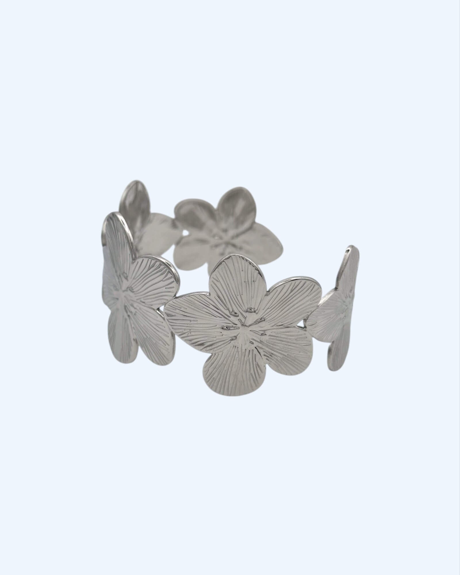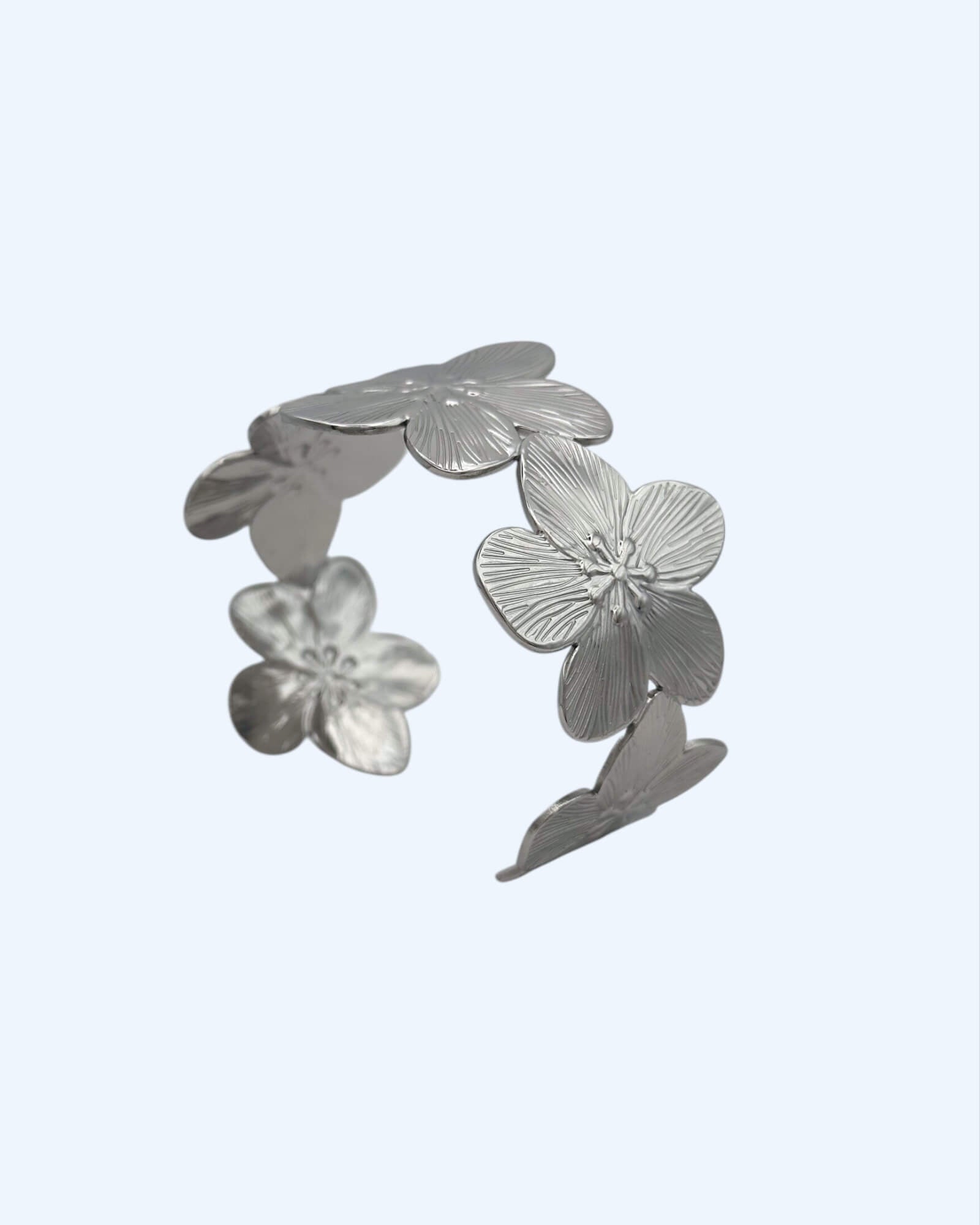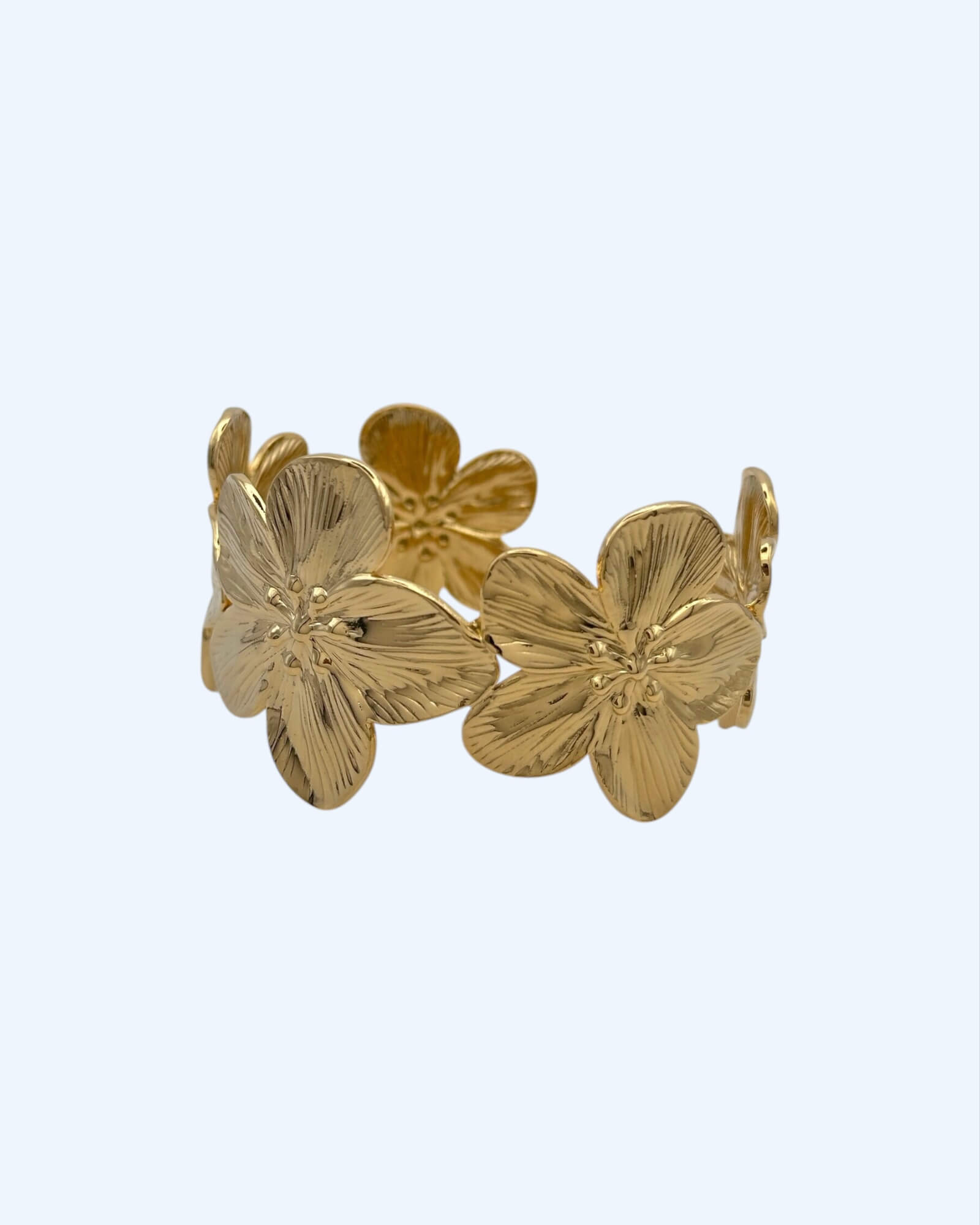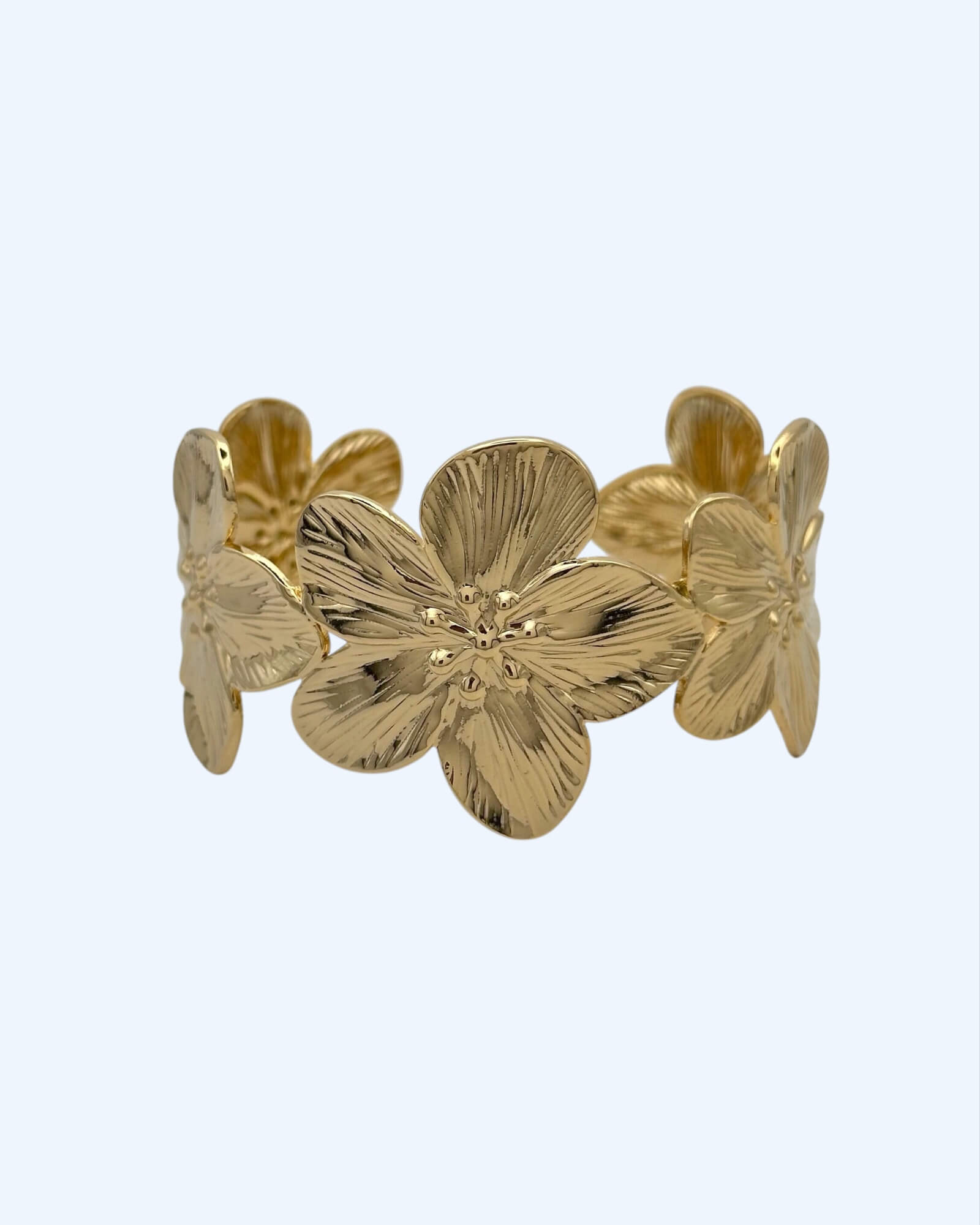 Pulseira rígida mas ajustável, com flores em relevo e acabamento polido. Totalmente em aço inoxidável, disponível em dourado e prateado. Uma peça simultaneamente bold e romântica.